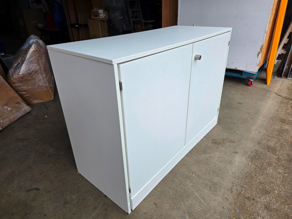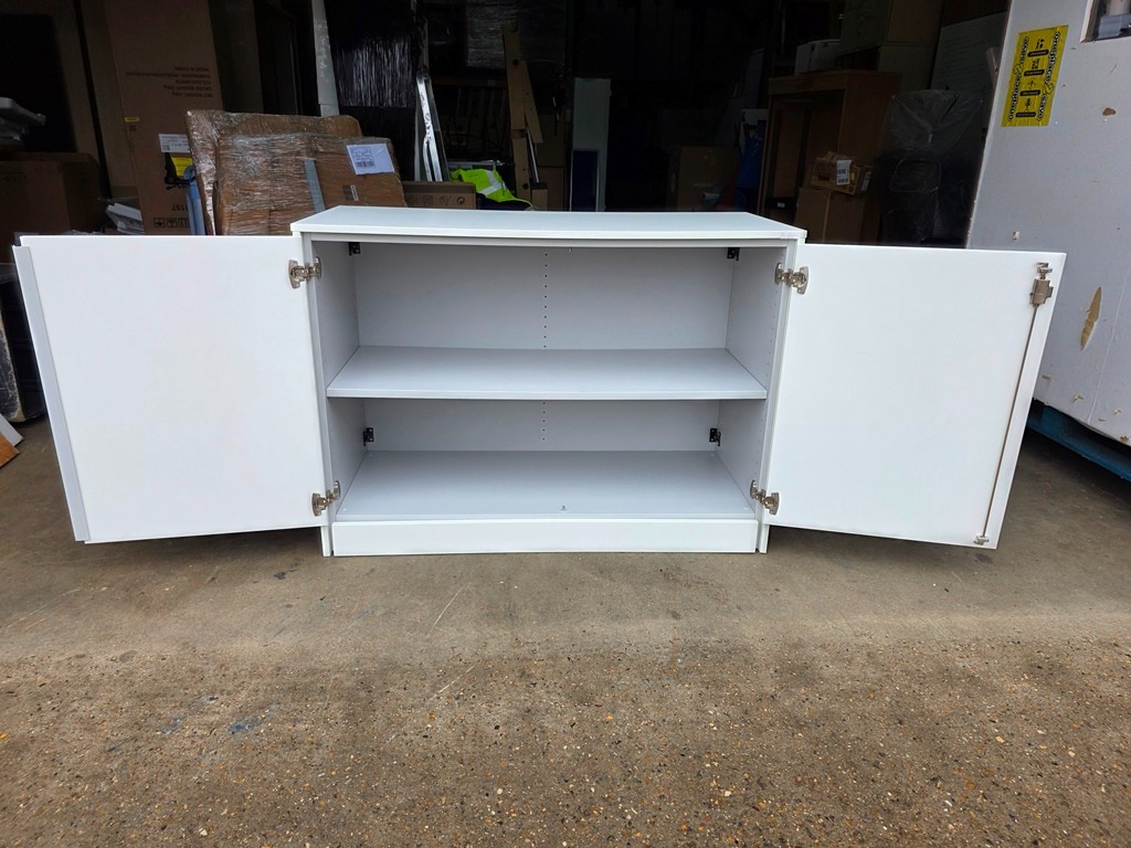Clean, modern white storage cupboard with double doors and an internal shelf – ideal for office, hallway, or home storage.