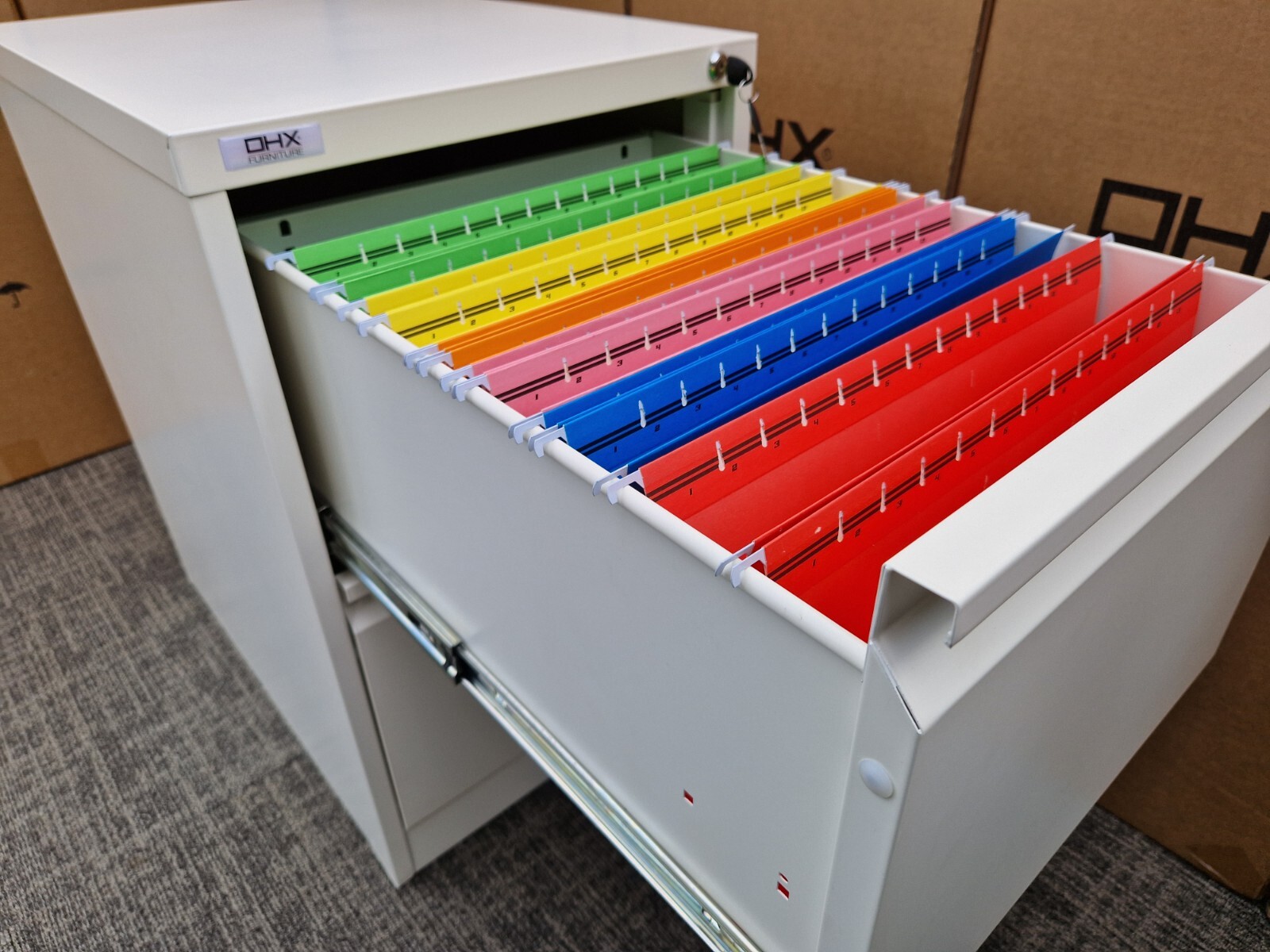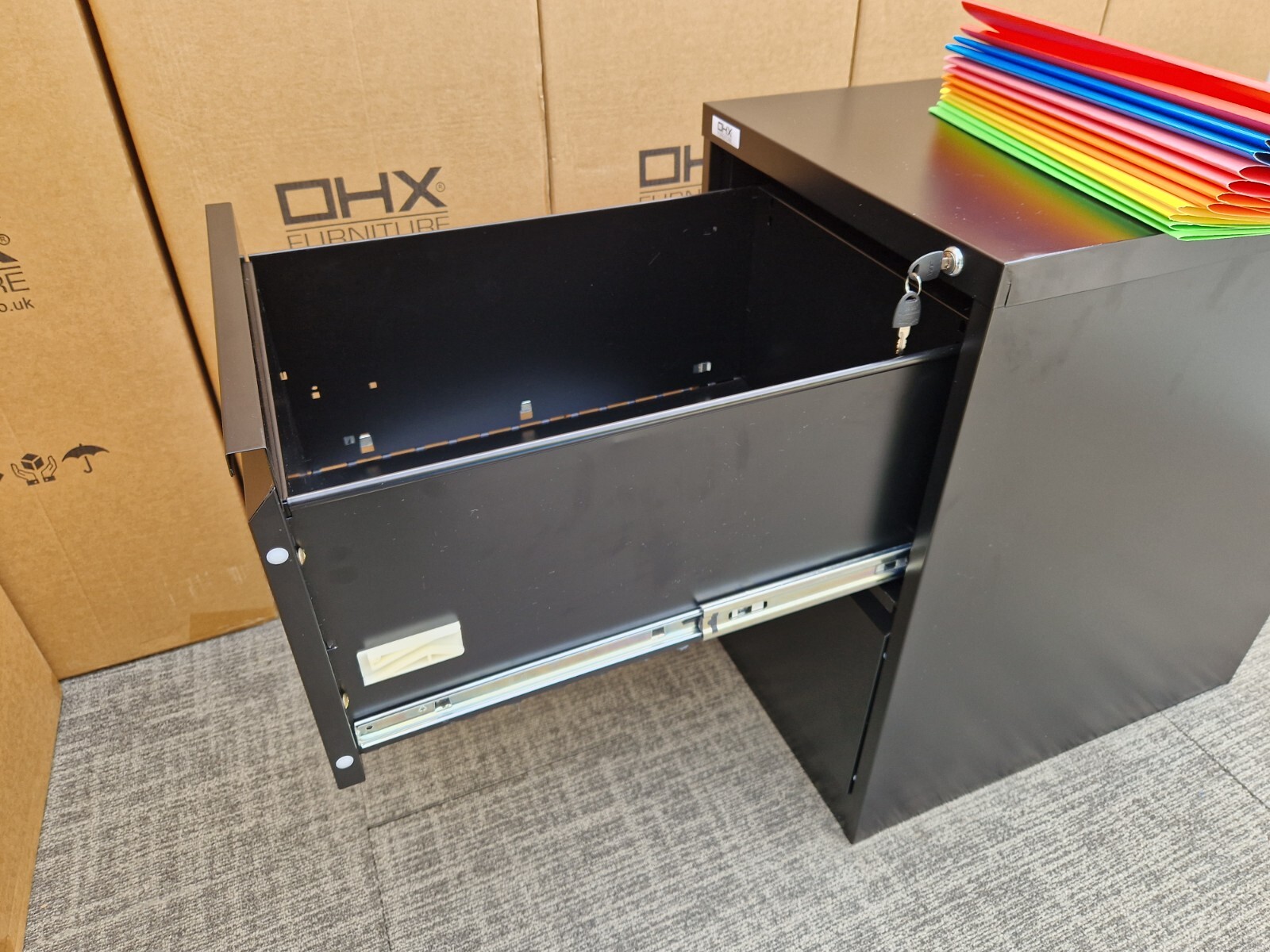 Most filing cabinets of this type sell another unit specificity to A4 to convert your filing cabinet from foolscap for use with A4 Suspension files. The OHX Furniture 2-Drawer filing cabinet comes with an adjustable bar to accommodate A4 suspension files or be used as a foolscap filing cabinet. The drawers offer an extra 20 kg weight capacity than the leading competitor. The ball guides allow the drawers to glide smoothly back and forth with virtually no noise.