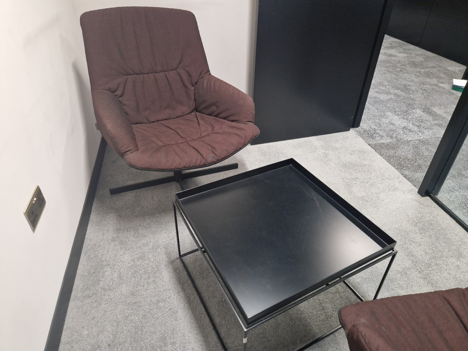 Set includes: 2 × Modus Milo swivel chairs + 1 × HAY Tray coffee/side table