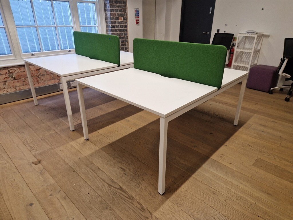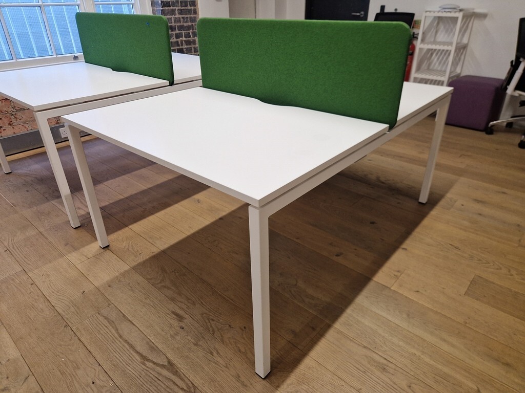 Create a clean, focused workstation for two with this back-to-back bench desk set. White rectangular tops sit on a robust steel frame with an extra-large central cable tray to keep power leads and adapters tidy. Navy blue fabric desktop screens provide privacy and reduce visual distractions—ideal for open-plan offices and teams.