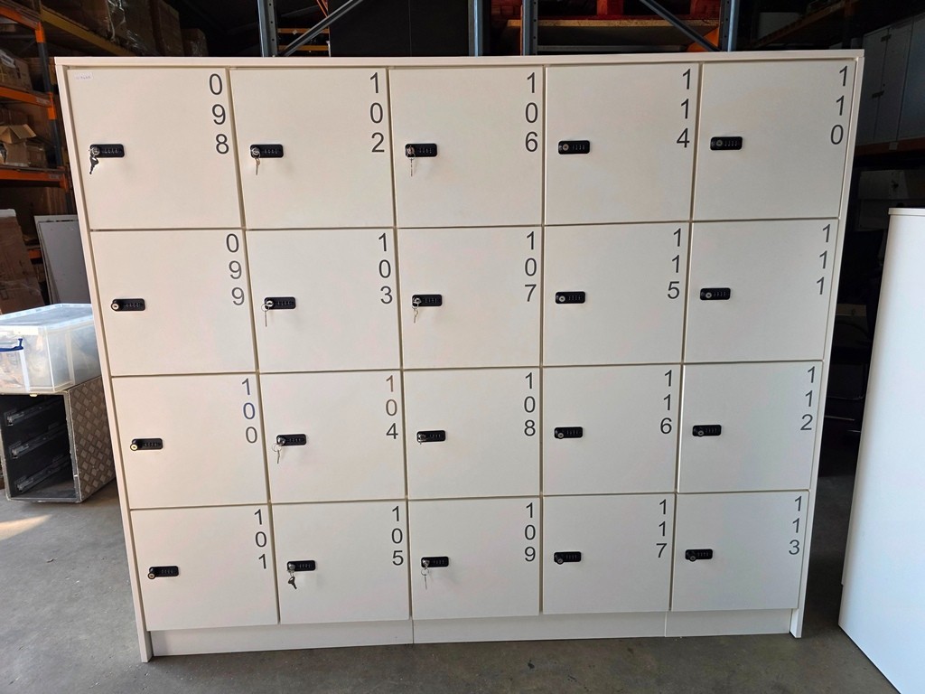 Large and practical 20 door locker storage unit, ideal for offices, staff rooms, shared workspaces, schools, gyms, studios, and other commercial environments needing secure individual storage.