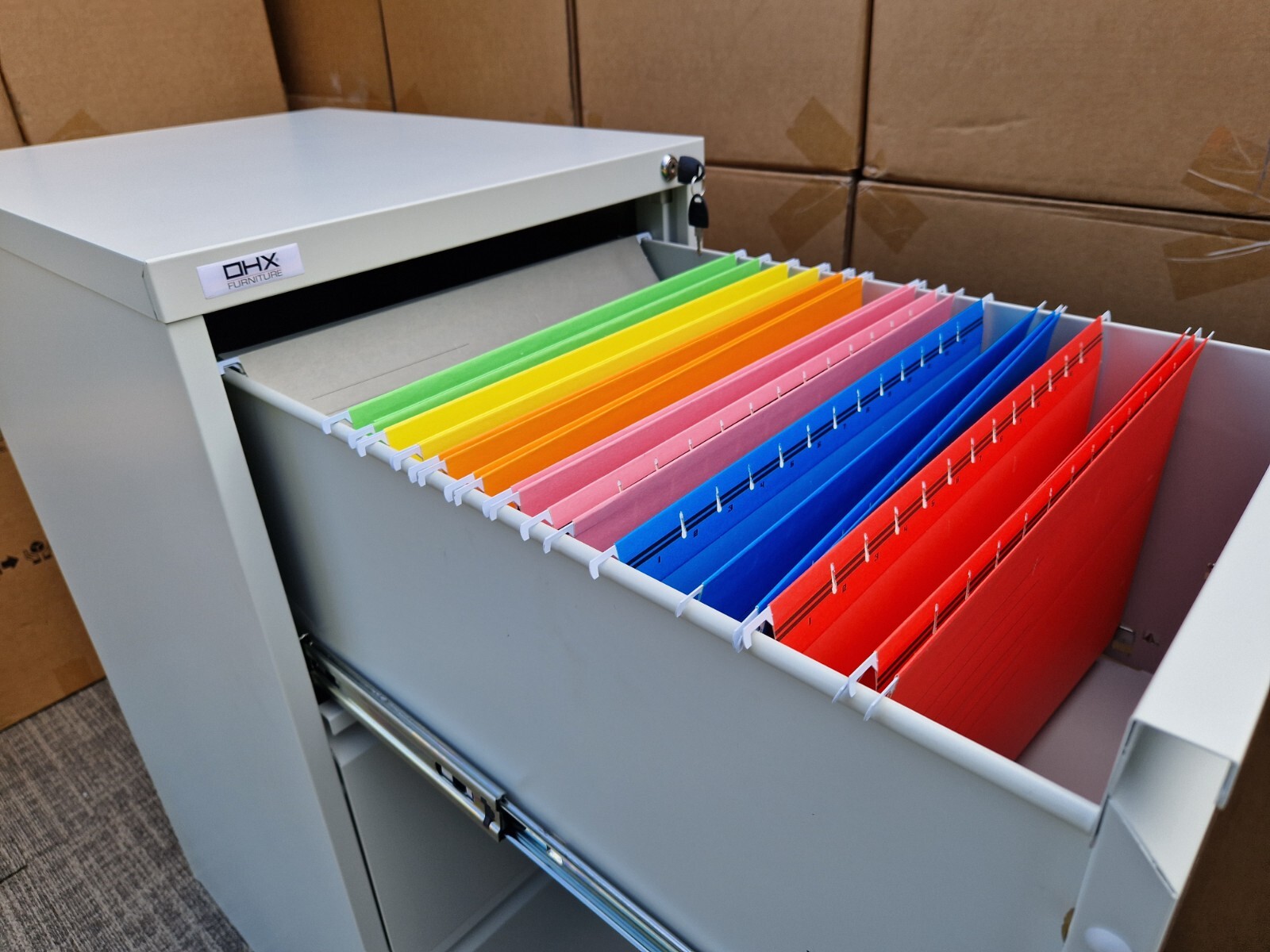 We offer the highest metal quality available, with a formaldehyde-free and odour-free construction. Most metal filing cabinets are sold between 0.6mm and 0.7mm thick. At OHX Furniture, you find filing cabinets that are 0.9mm thick. The metal comprises a steel base, anti-rust layer and powder coating, making our cabinets 0.8mm thick before coating and 0.9mm after coating and painting.