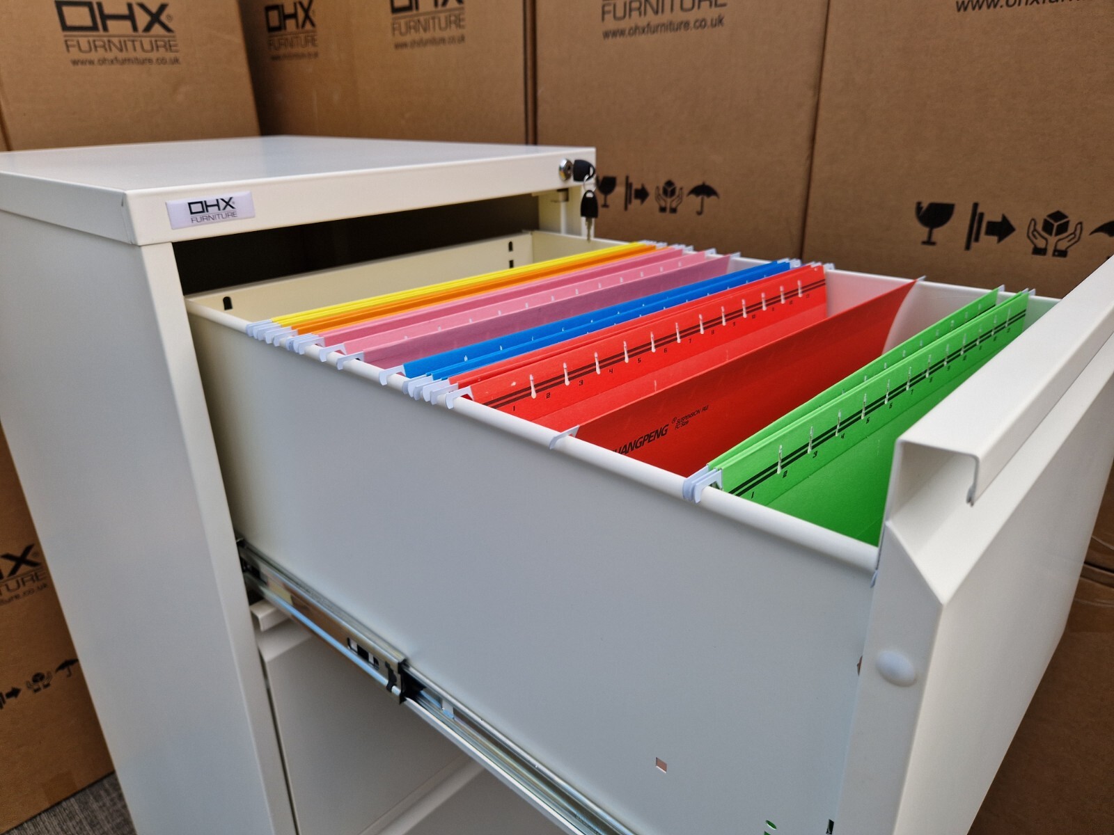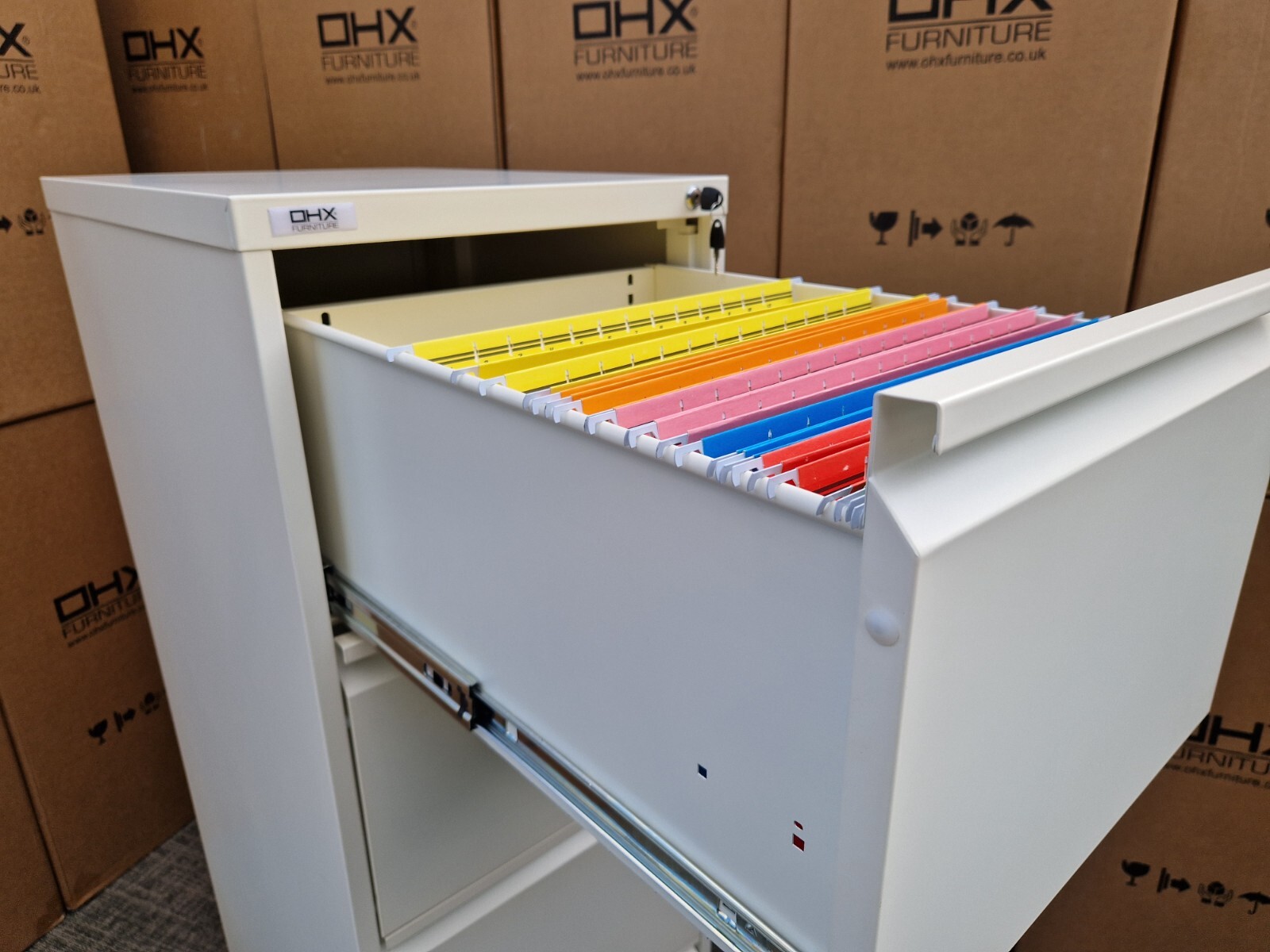 Most 4-drawer filing cabinets of this type will be A4-size suspension filing cabinets. The OHX Furniture 4-drawer filing cabinet is more versatile. An adjustable bar enables the cabinet to be used for a foolscap filing system, or accommodate A4 suspension files, the choice is yours.