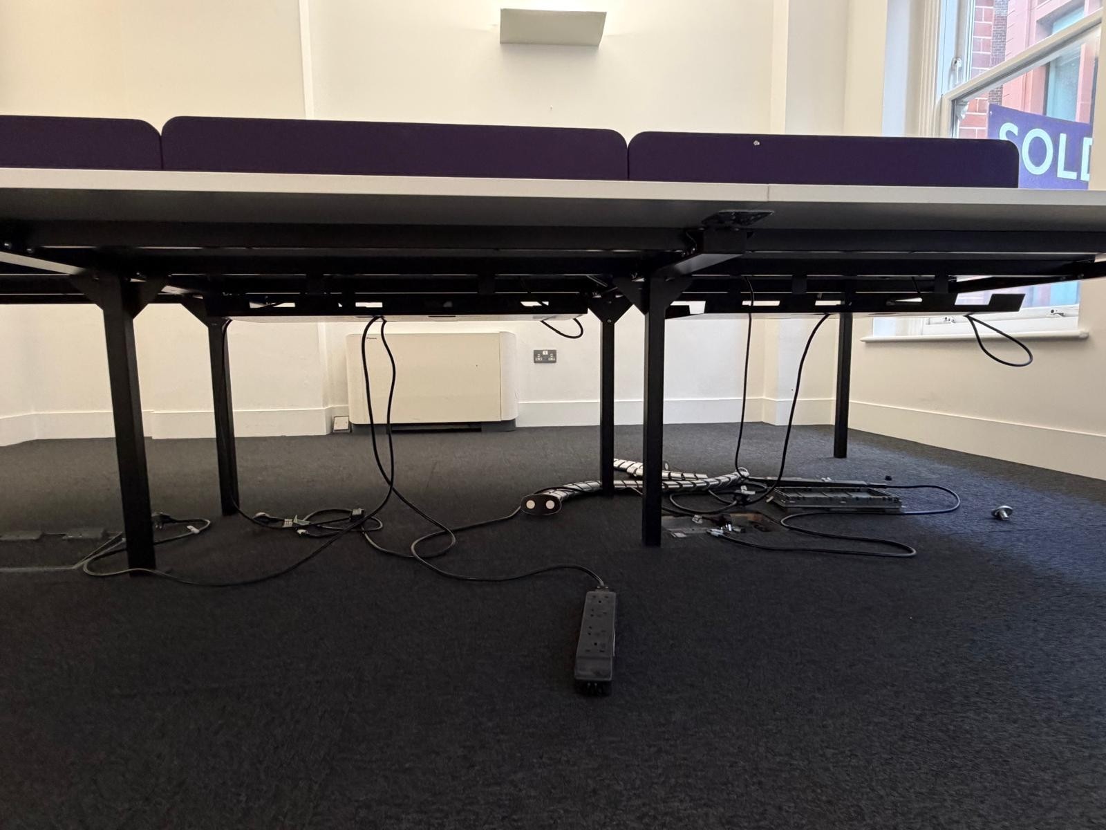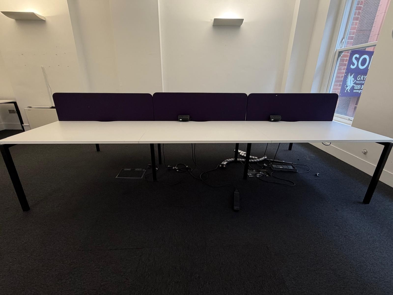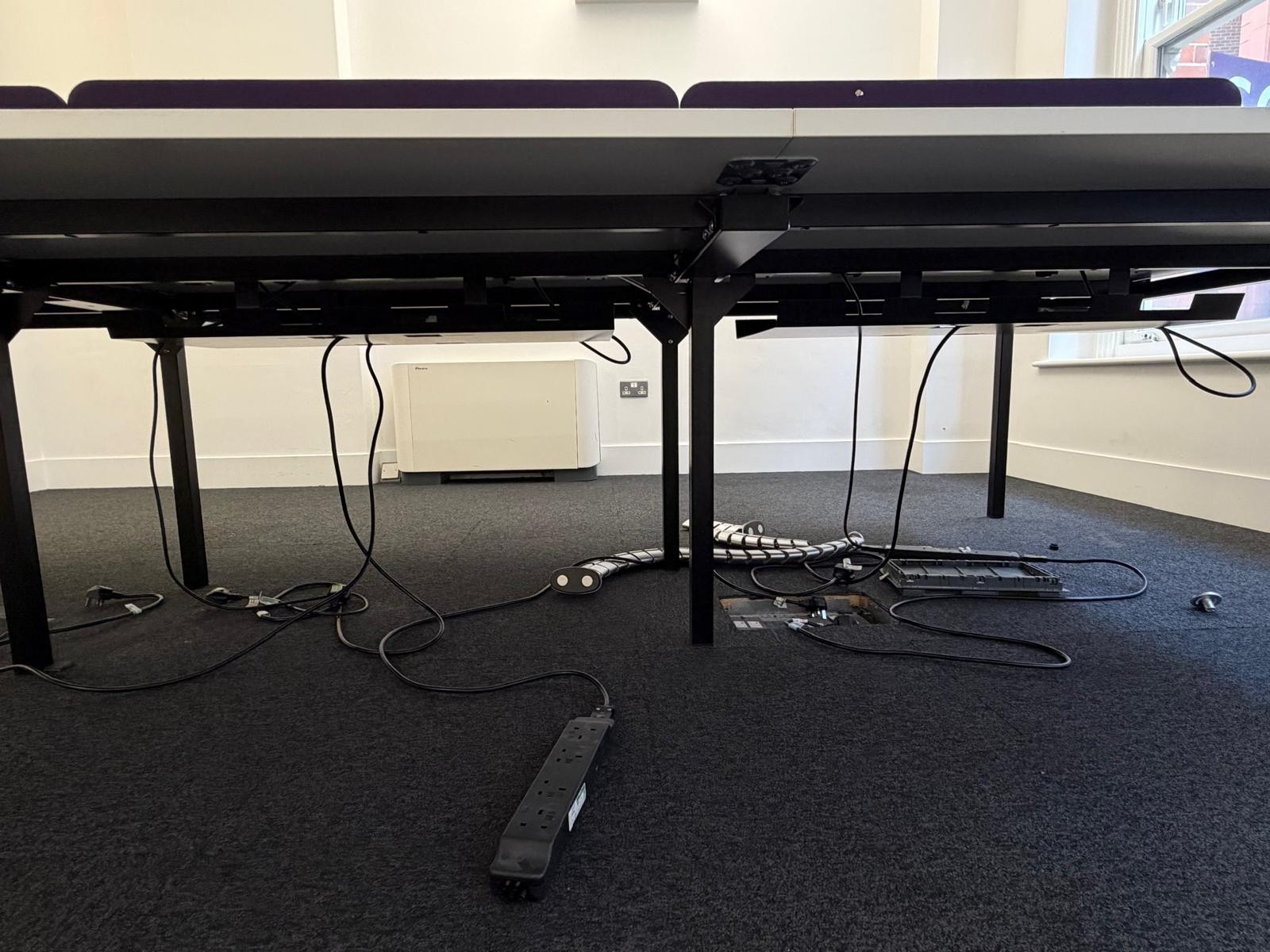 Large 6-person bench desk ideal for open-plan offices, co-working or call-centre setups. Includes 3 divider screens and integrated UK power modules (see photos).