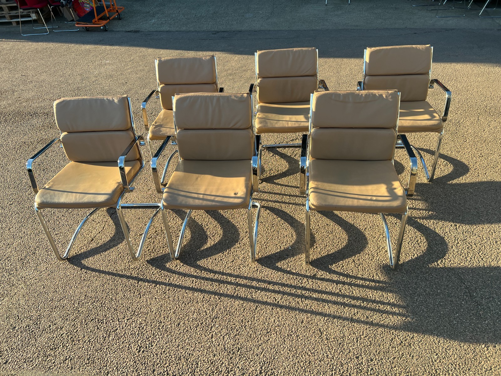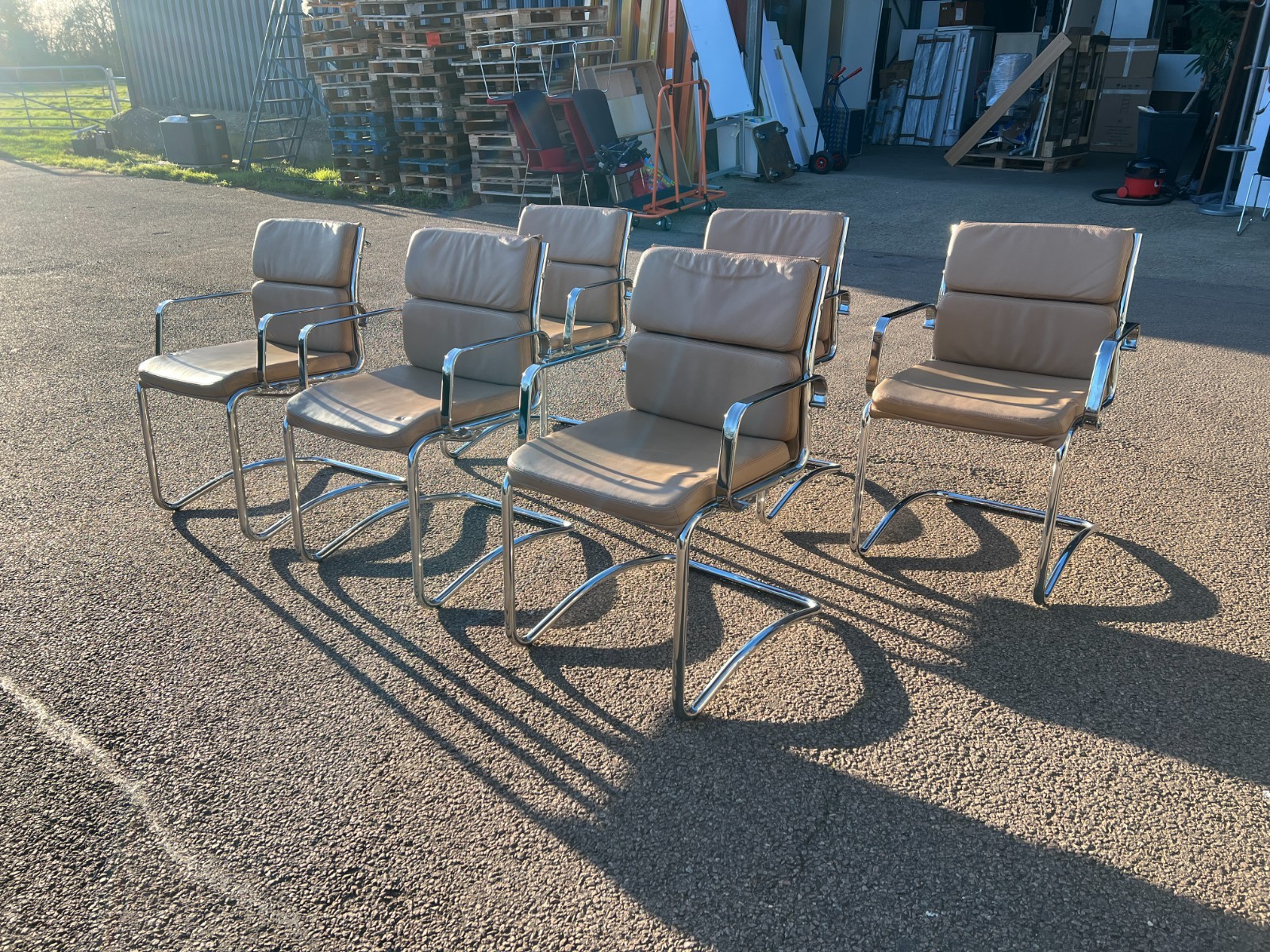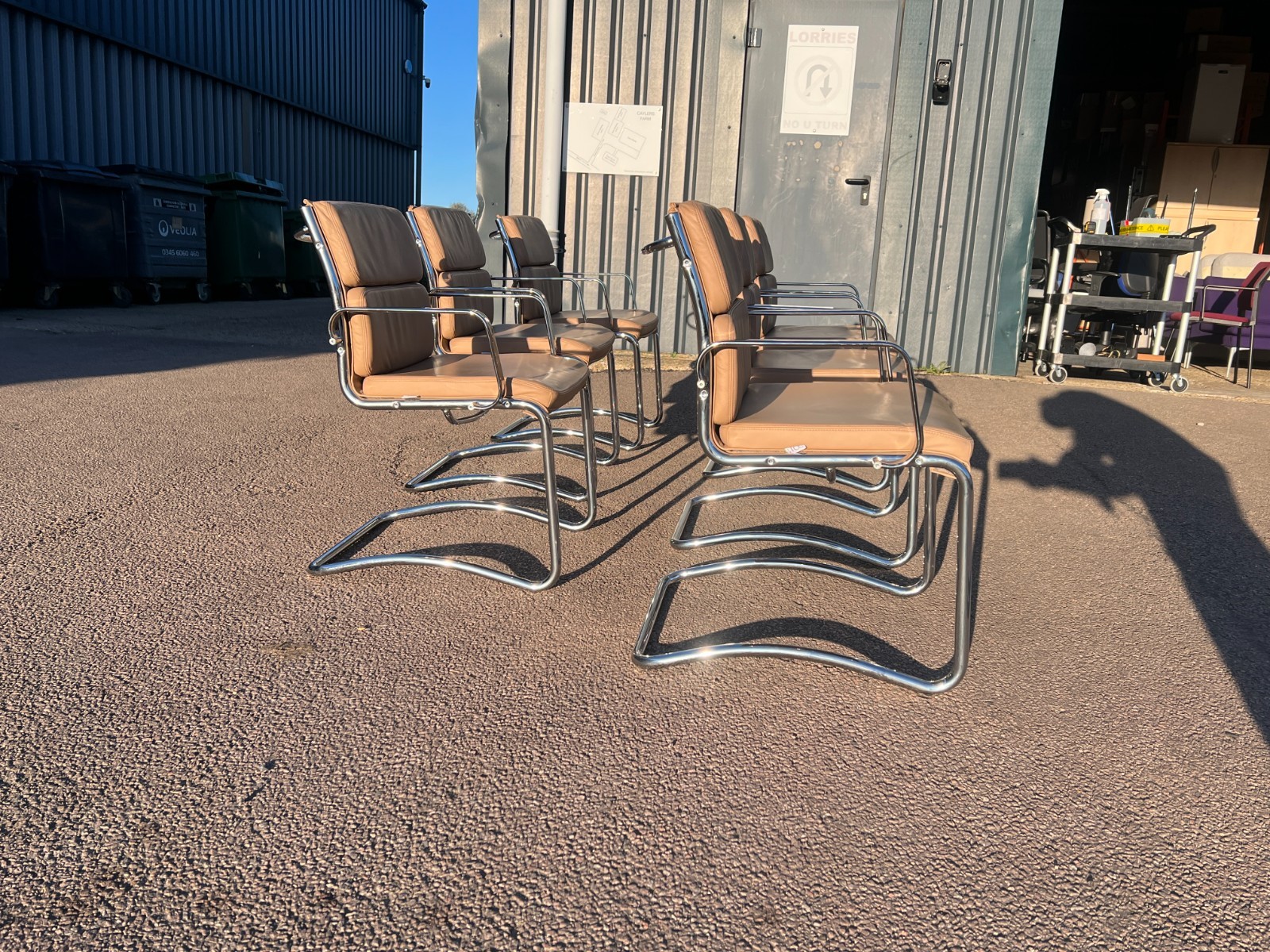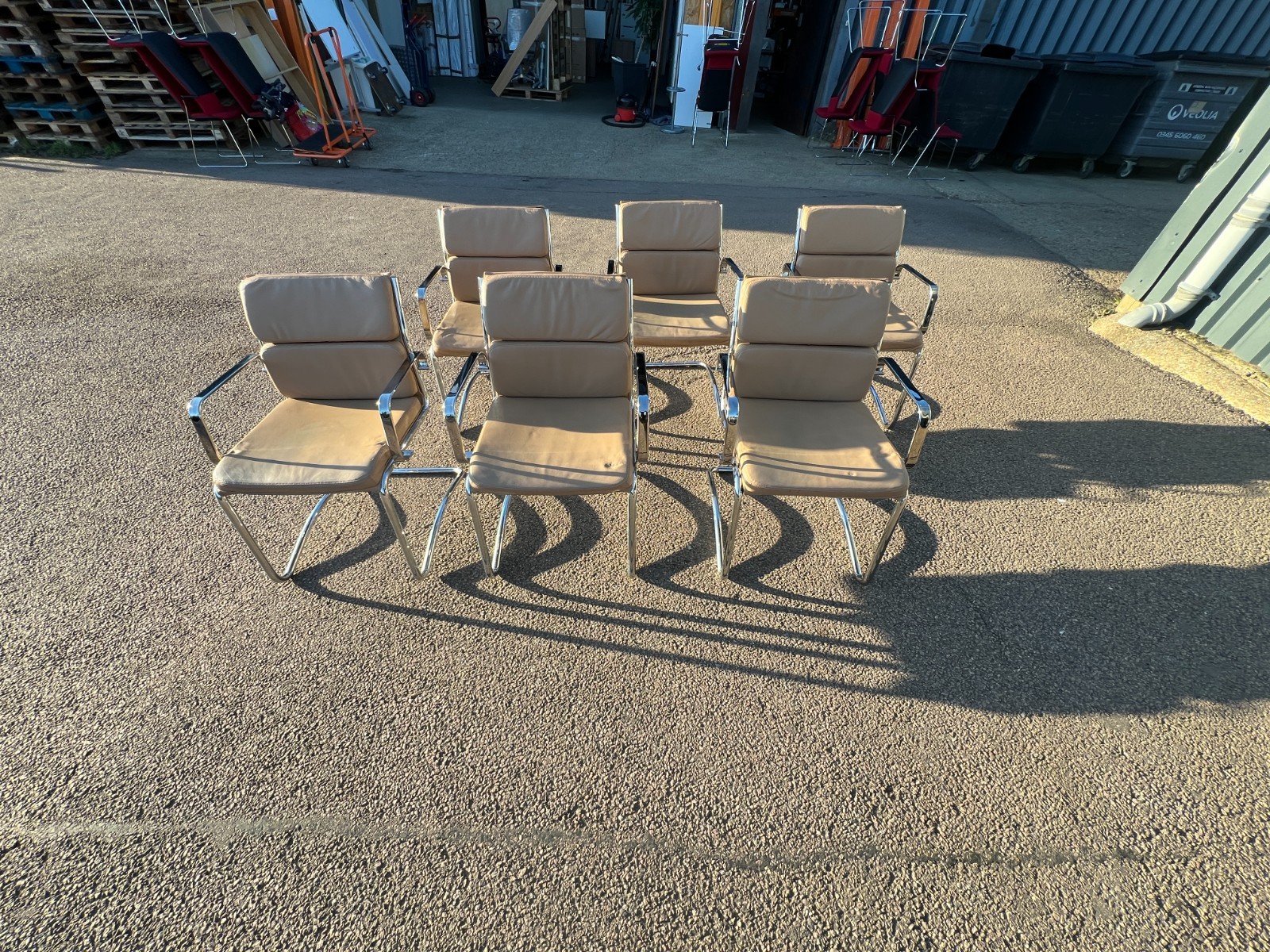 Set of 6 Cantilever Visitor/Dining Chairs (Beige) – Upholstered + Polished Metal Frame