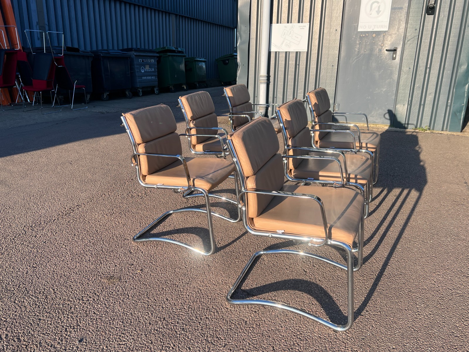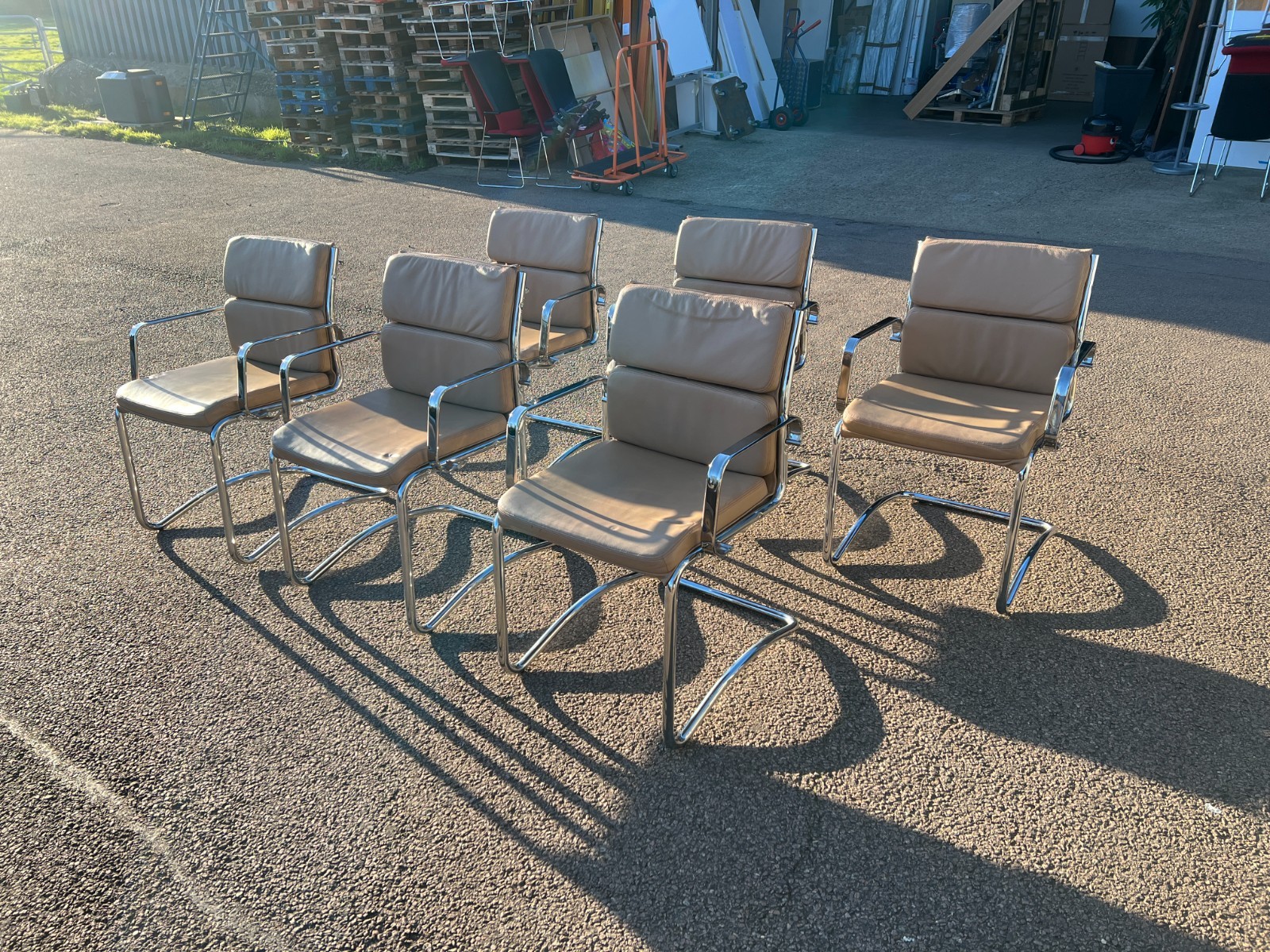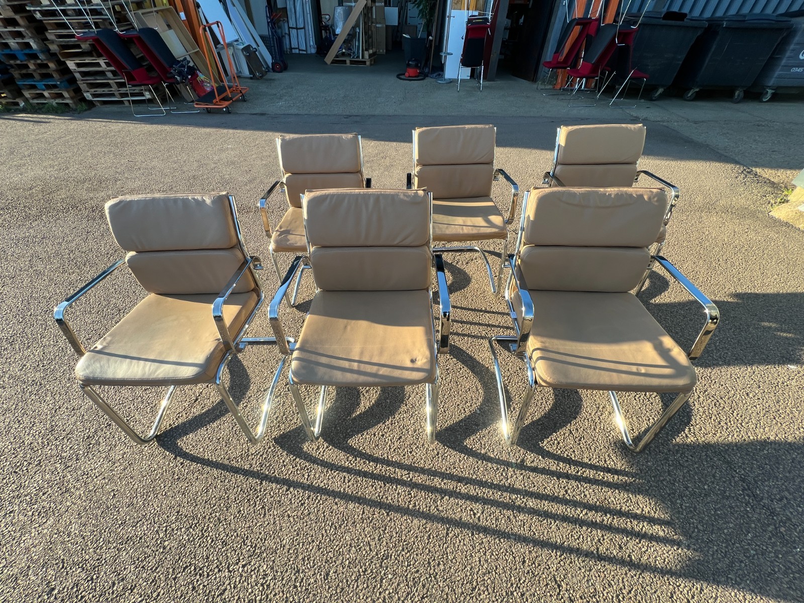 Set of 6 Cantilever Visitor/Dining Chairs (Beige) – Upholstered + Polished Metal Frame
