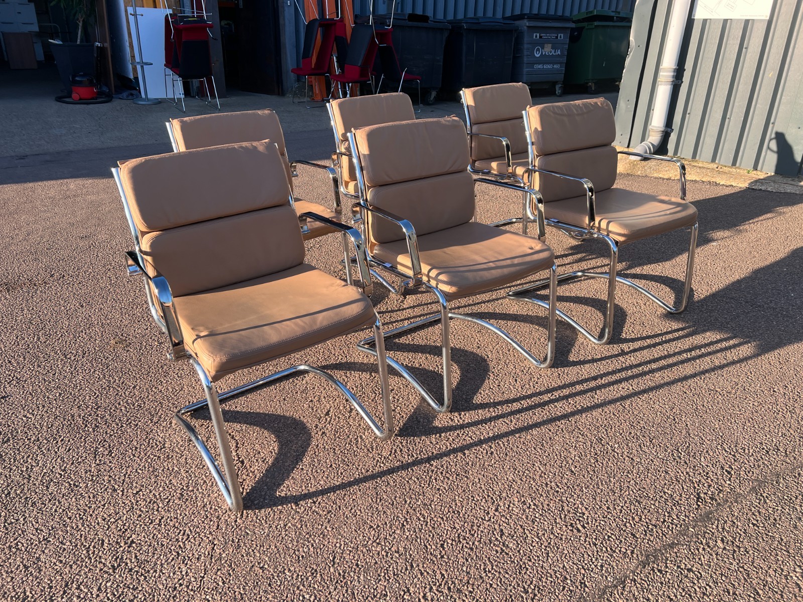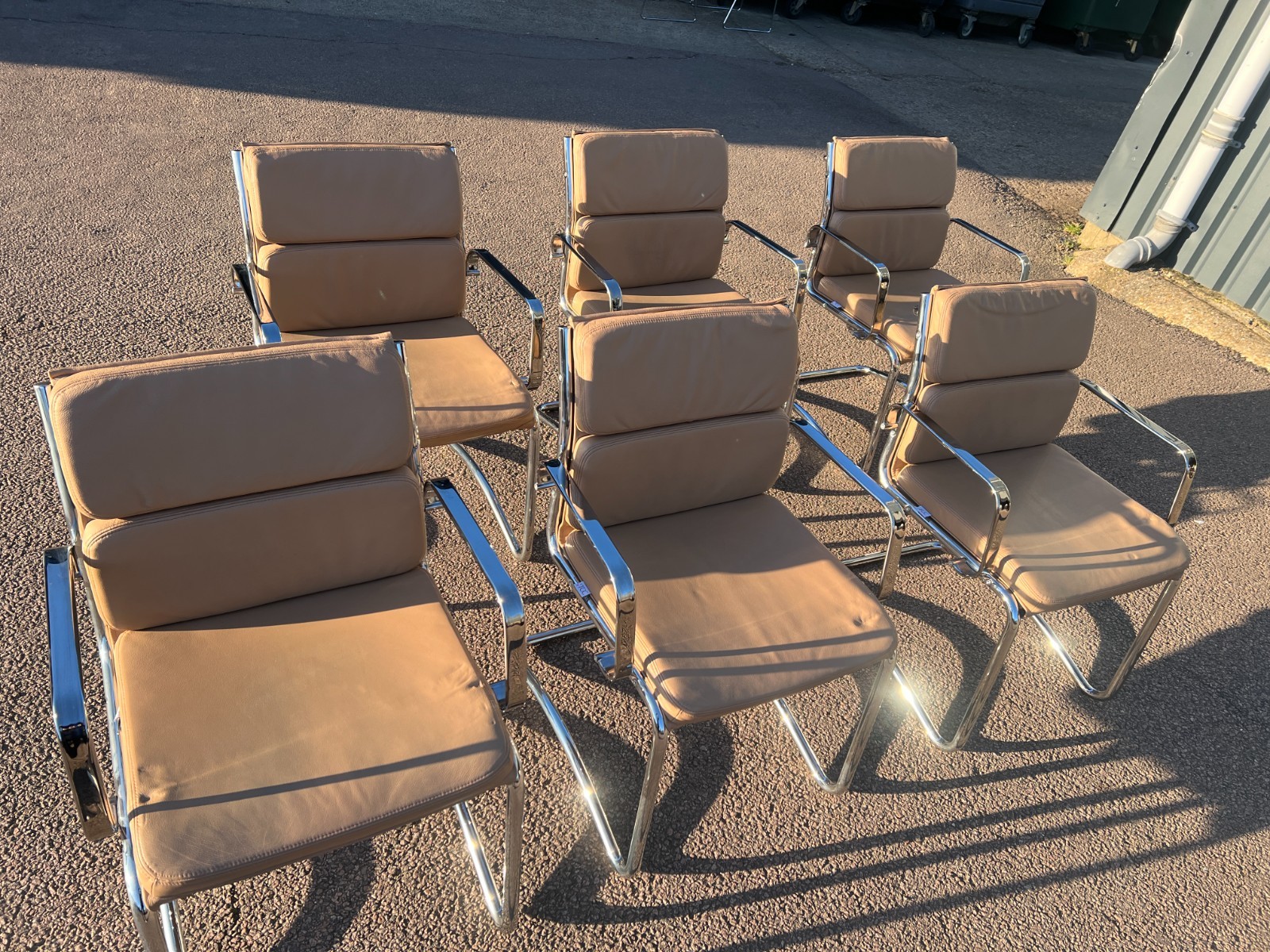 A smart set of 6 matching cantilever chairs with armrests and cushioned seat/back pads – ideal for meeting rooms, reception/visitor seating, dining, or studio spaces.