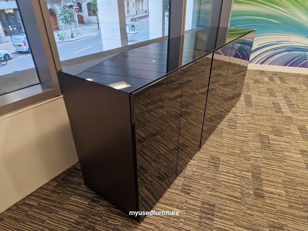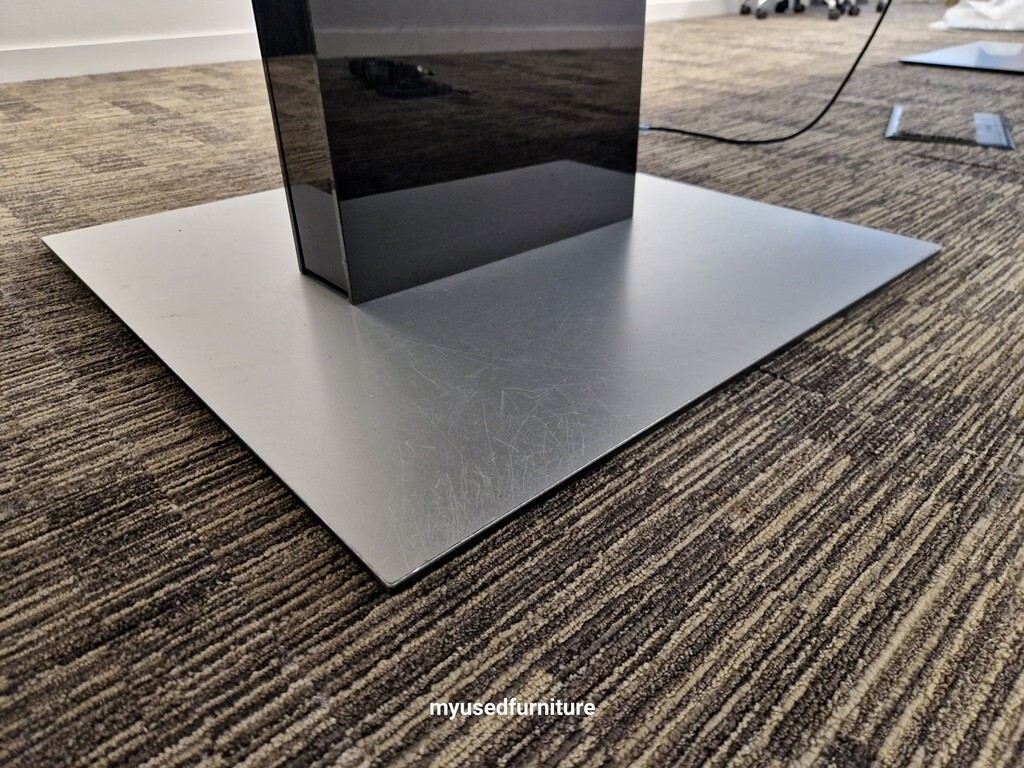 This Bene P2 boardroom and meeting table delivers a modern, professional presence with integrated cable management and a sleek stainless steel base. Designed for large meetings and collaborative environments, it combines functionality with elegant design. The set also includes a high-quality black gloss credenza with glass top, providing both storage and style.