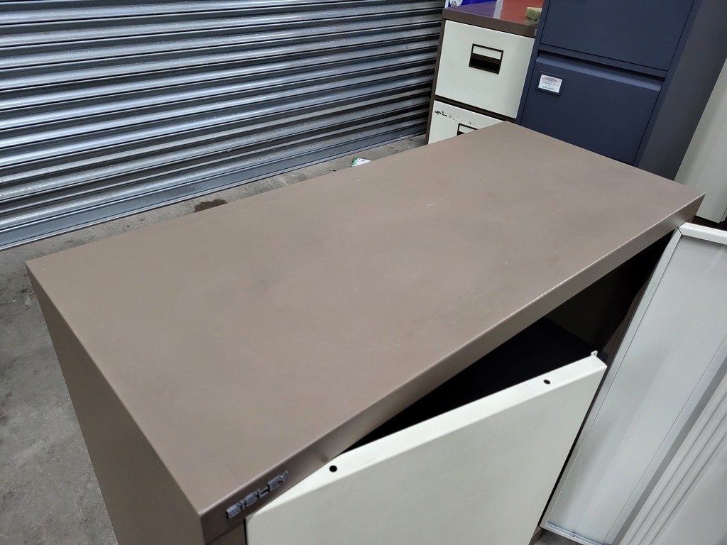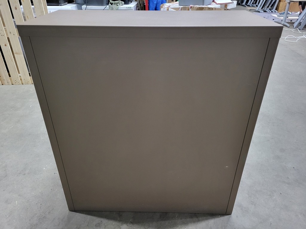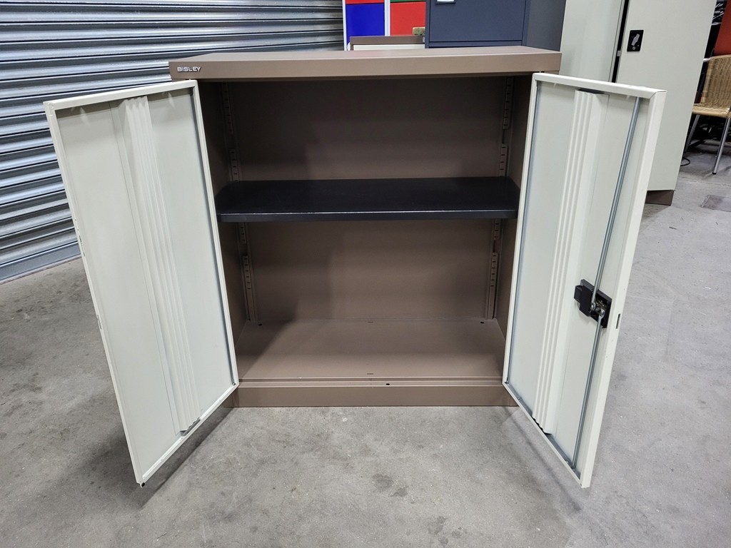 A practical mid-height Bisley storage cupboard in a smart brown finish, ideal for offices, schools, reception areas, and other professional environments where secure, space-efficient storage is needed.