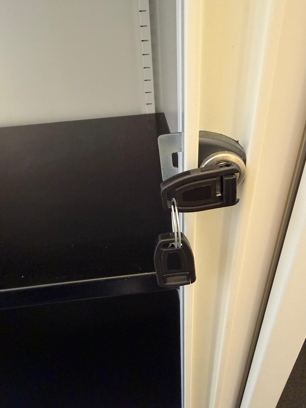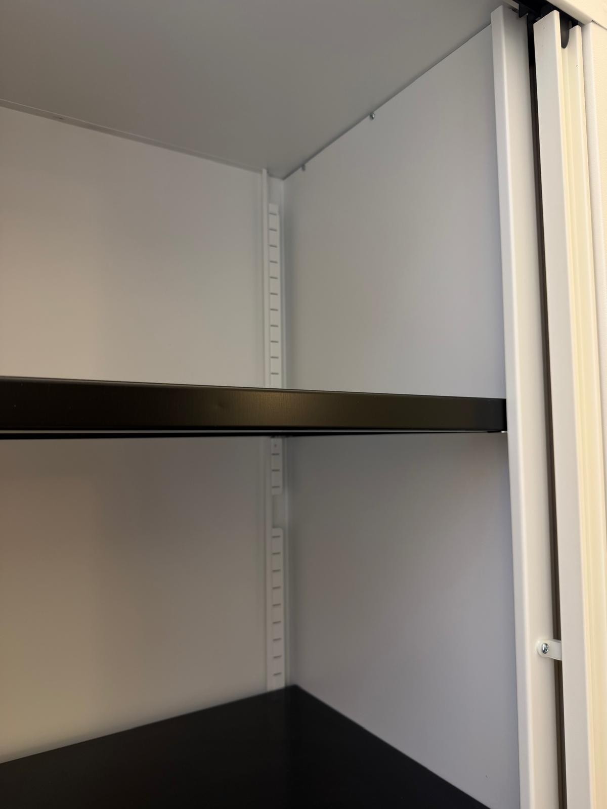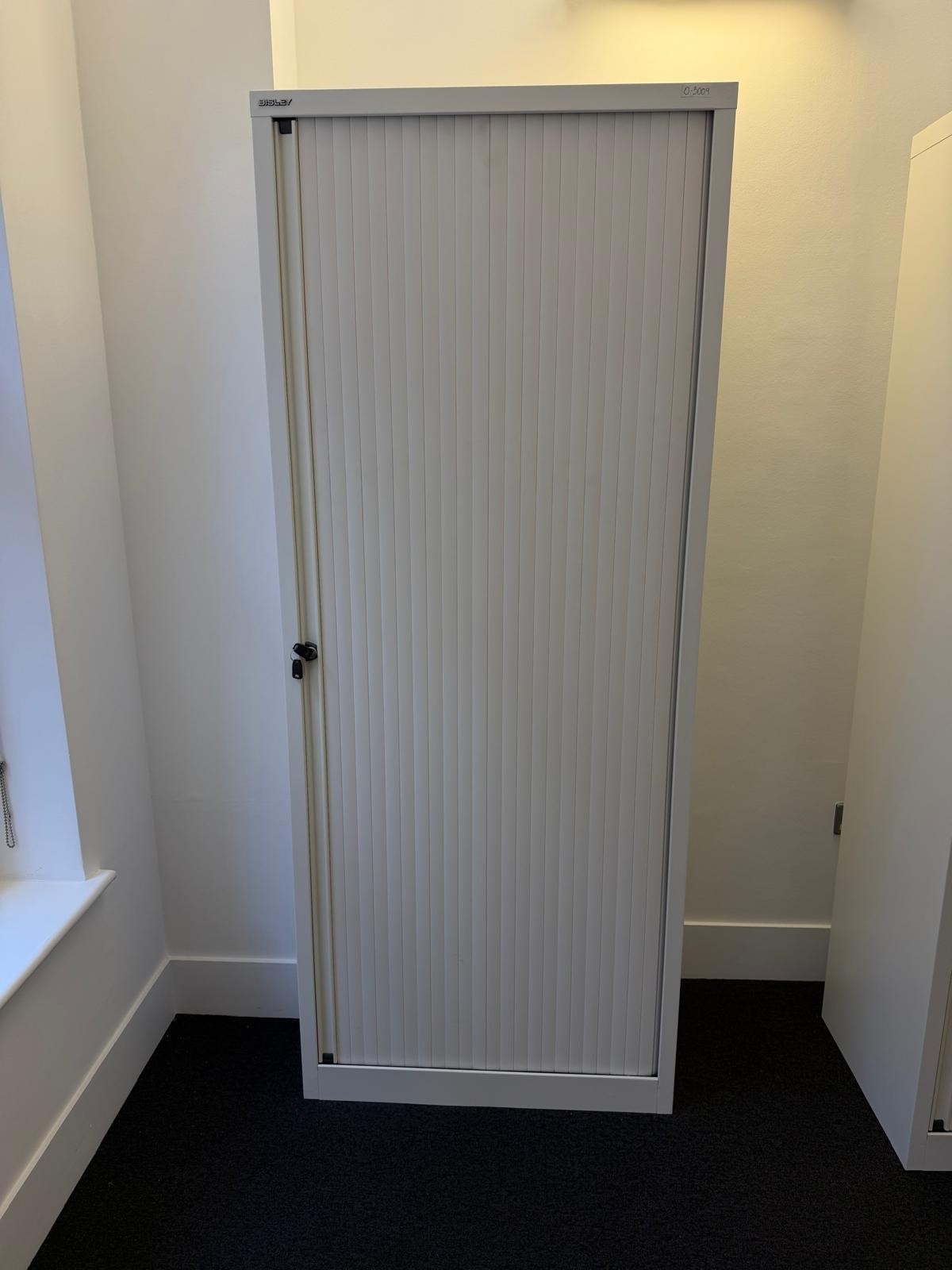 Space-saving Bisley office storage cupboard with a sliding tambour door – ideal for files, stationery and general workplace storage.