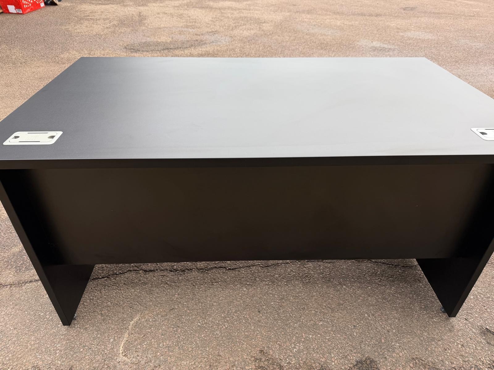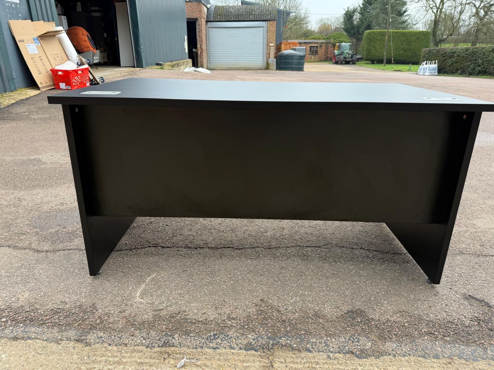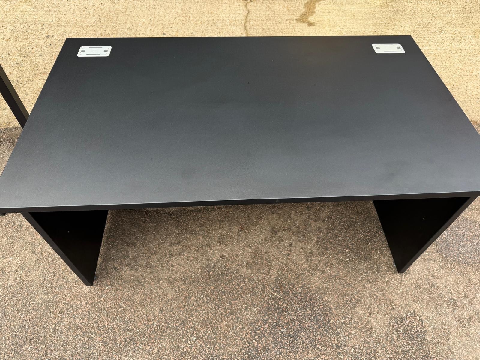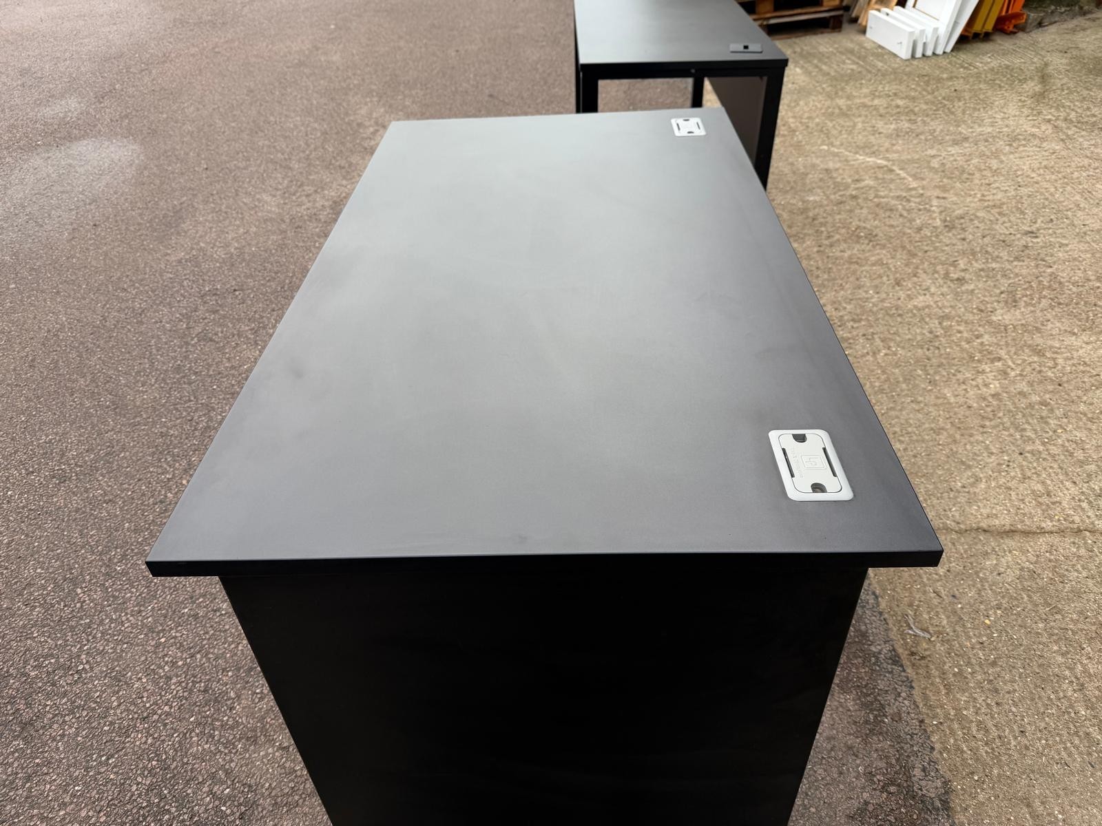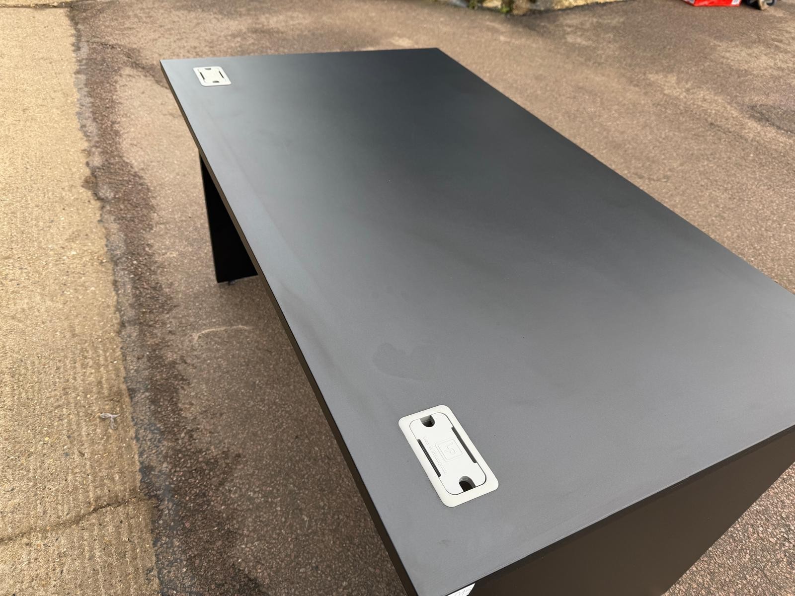 Large, clean-looking black workstation desk – ideal for home office or commercial use, with tidy cable access on the desktop.