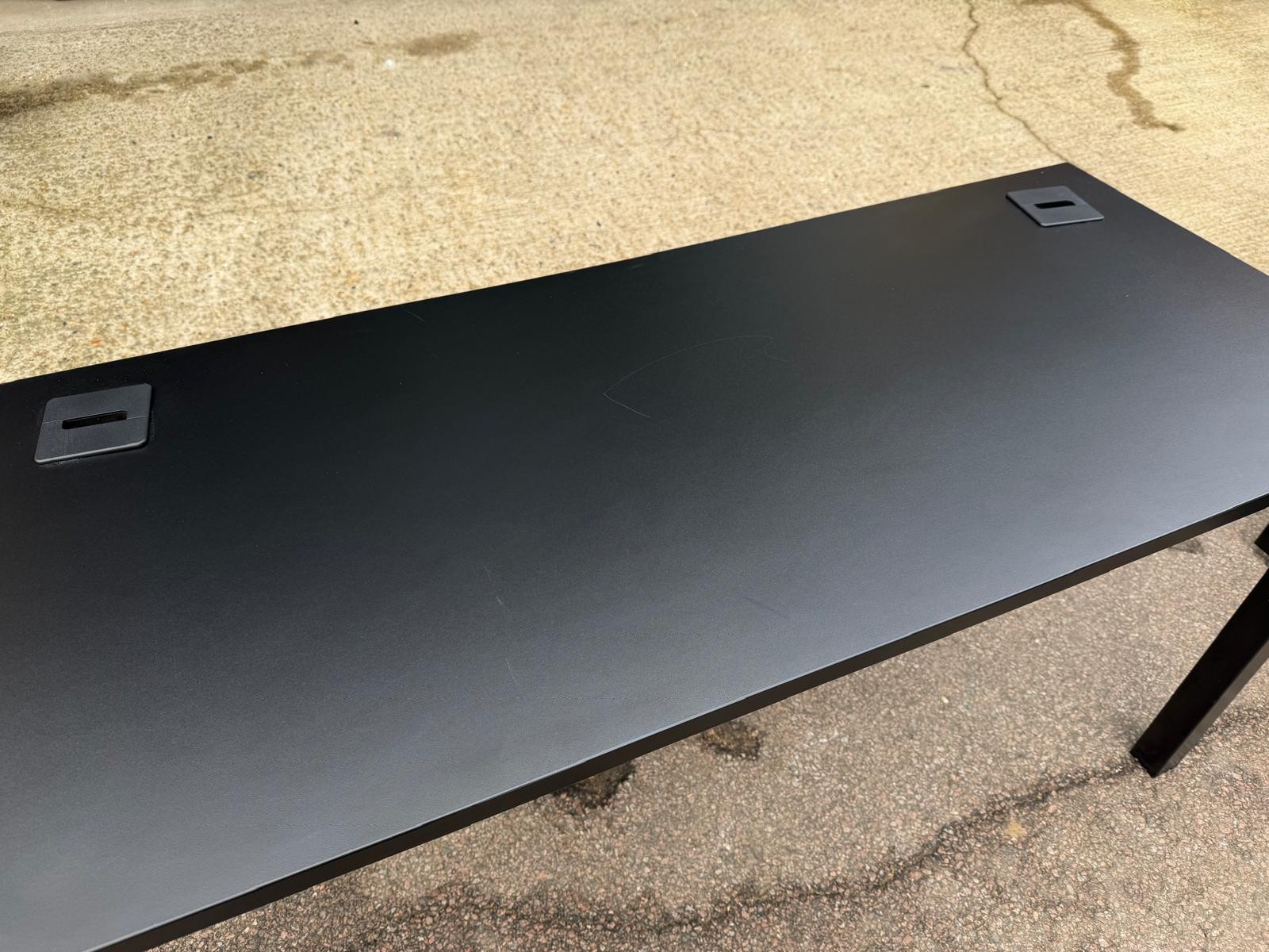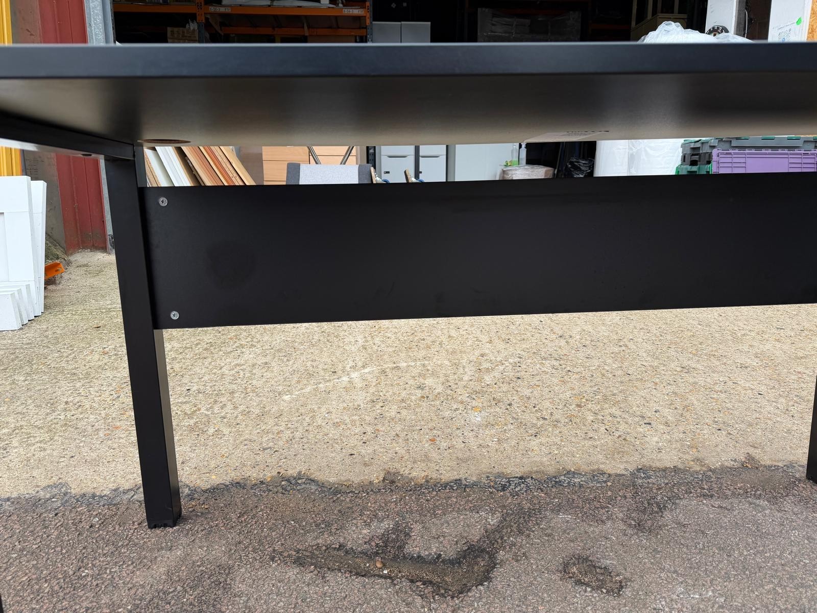 Modern black workstation desk ideal for a home office or study setup, with built-in cable management and a privacy/modesty panel for a clean, professional look.