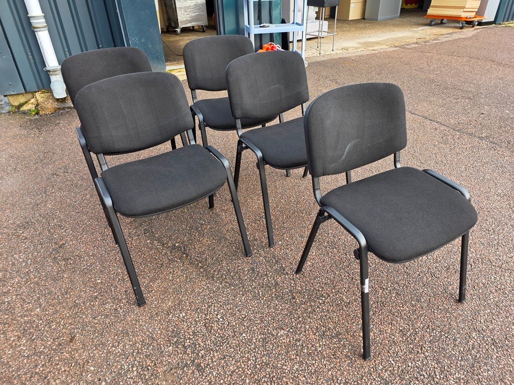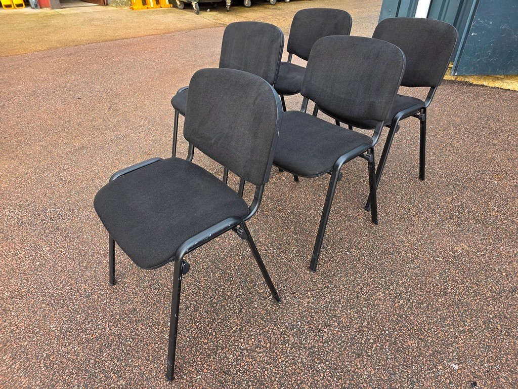Smart, practical set of five matching visitor/meeting chairs in black upholstery with a sturdy black frame. These chairs stack neatly to save space, making them ideal for meeting rooms, training rooms, receptions, waiting areas, and breakout spaces.