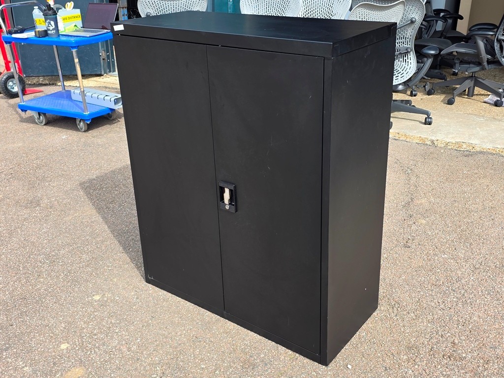 A practical black 2 door storage cupboard, ideal for offices, stock rooms, workshops, utility spaces, and general workplace storage.