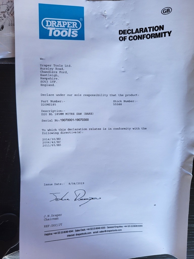 • Genuine Draper D20 20V Brushless Sliding Compound Mitre Saw With 185Mm Blade Diameter.