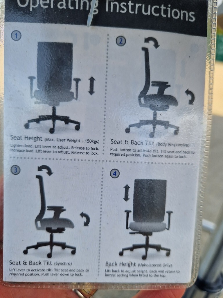 Body weight responsive mechanism – Seat angle adjustment lockable in 5 positions – (range of adjustment 60°) – Back angle adjustment lockable in 5 positions (range of adjustment 20°)