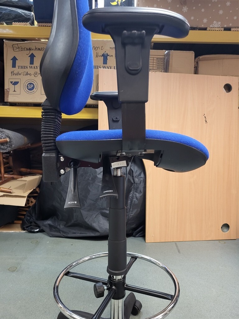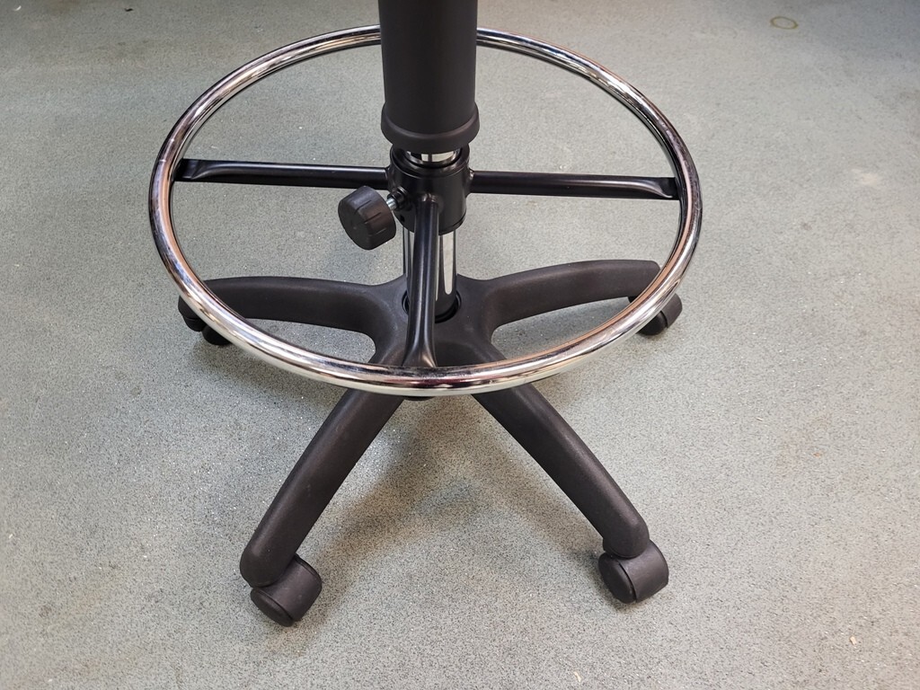 Professional draughtsman chair with adjustable footring, ideal for use with standing desks, laboratories, workshops, studios, and elevated workstations. Equipped with a brand-new chrome gas lift and adjustable footrest ring, this chair provides reliable ergonomic support and comfort for extended daily use.