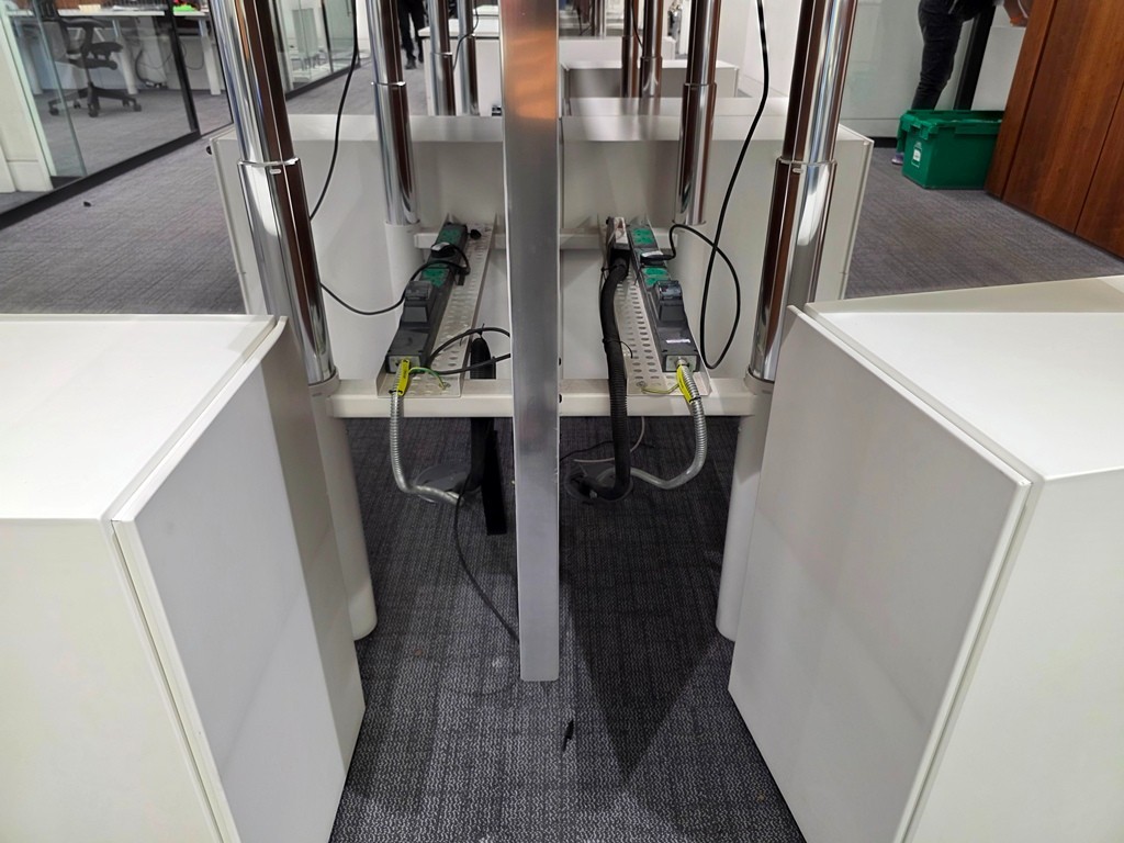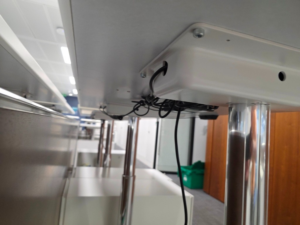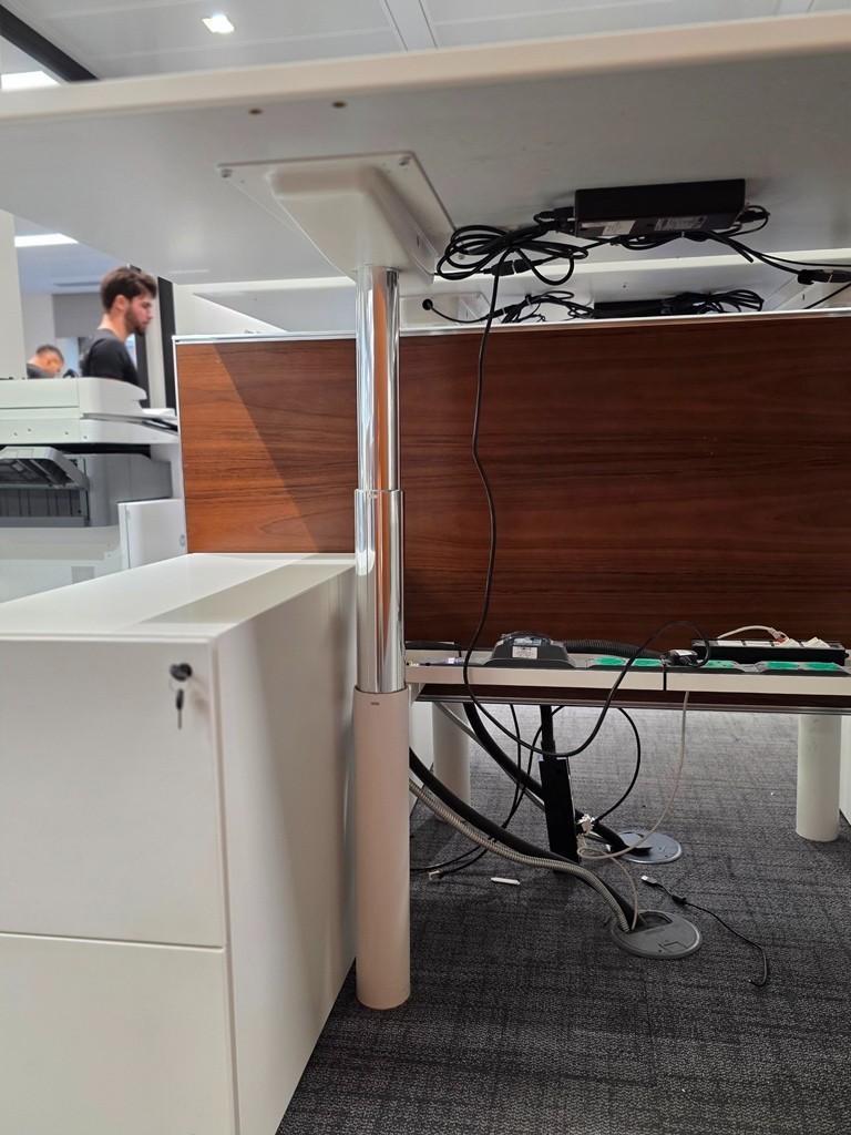 This premium set of Linak electric height adjustable desks delivers excellent performance, smooth lifting and strong commercial-grade construction. Supplied as two double desks, the configuration provides seating for four people. Each desk features a round-leg frame, smooth motorised height adjustment and a durable white 25 mm MFC desktop.