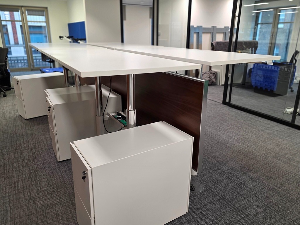 The desks are supplied dismantled for safe handling. The walnut privacy panel is very heavy and requires two people to lift. The pedestal is supplied fully assembled. No formal assembly guide is provided, but setup is straightforward for experienced users.