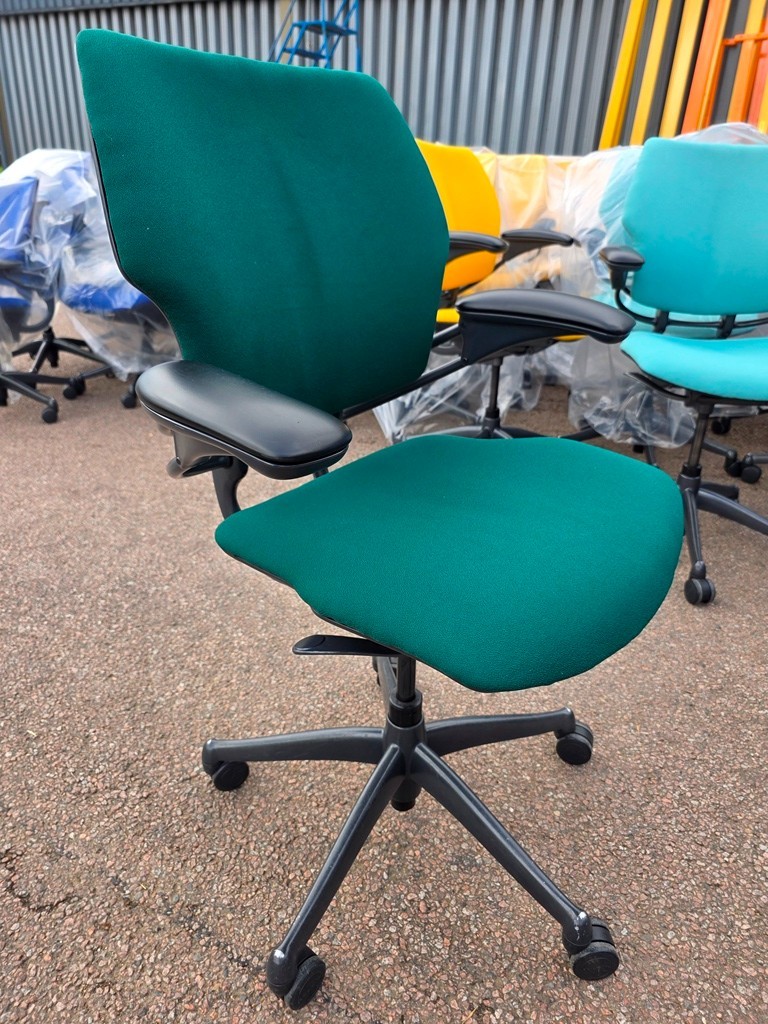 The Humanscale Freedom chair is one of the most recognised ergonomic office chairs in the world, designed to deliver exceptional comfort, intelligent support, and premium build quality. This professionally refurbished model features brand-new Racing Green upholstery, combining sustainability with high-end performance for professional offices, studios, and home workspaces.