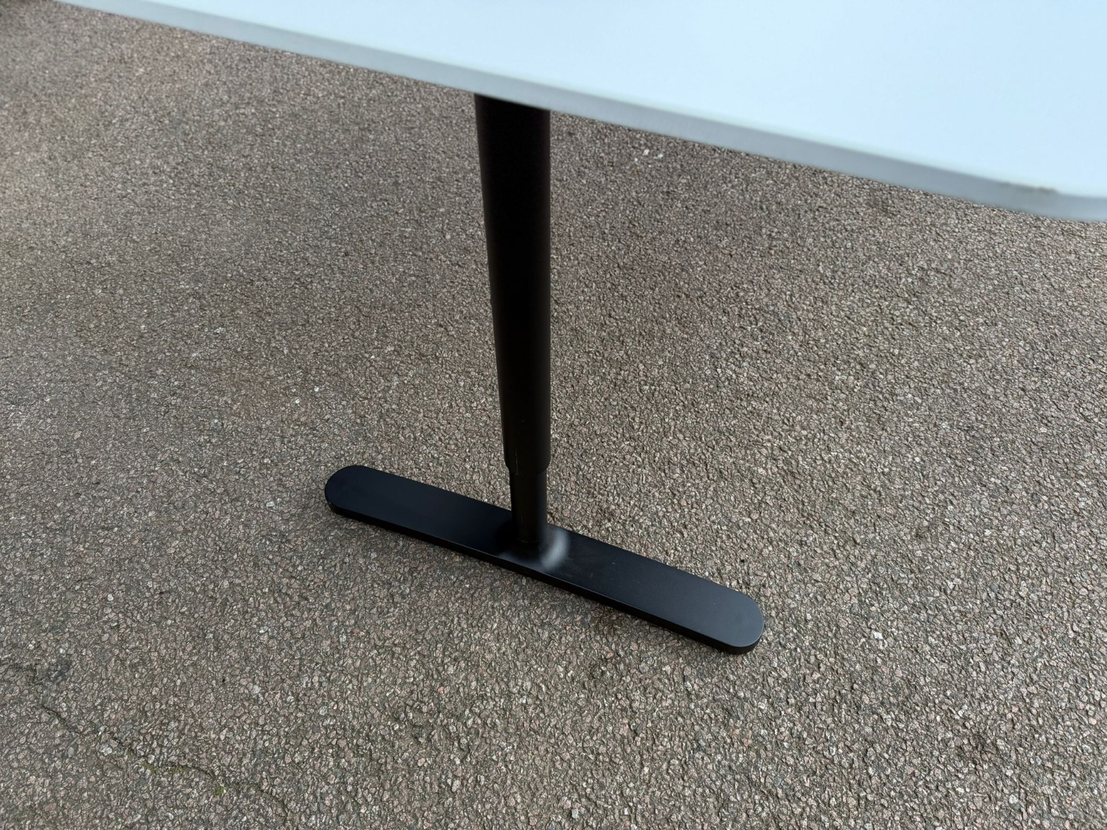 Modern IKEA BEKANT office desk with a clean white worktop and sturdy black T-legs. This is a manual height-adjustable model (not electric),