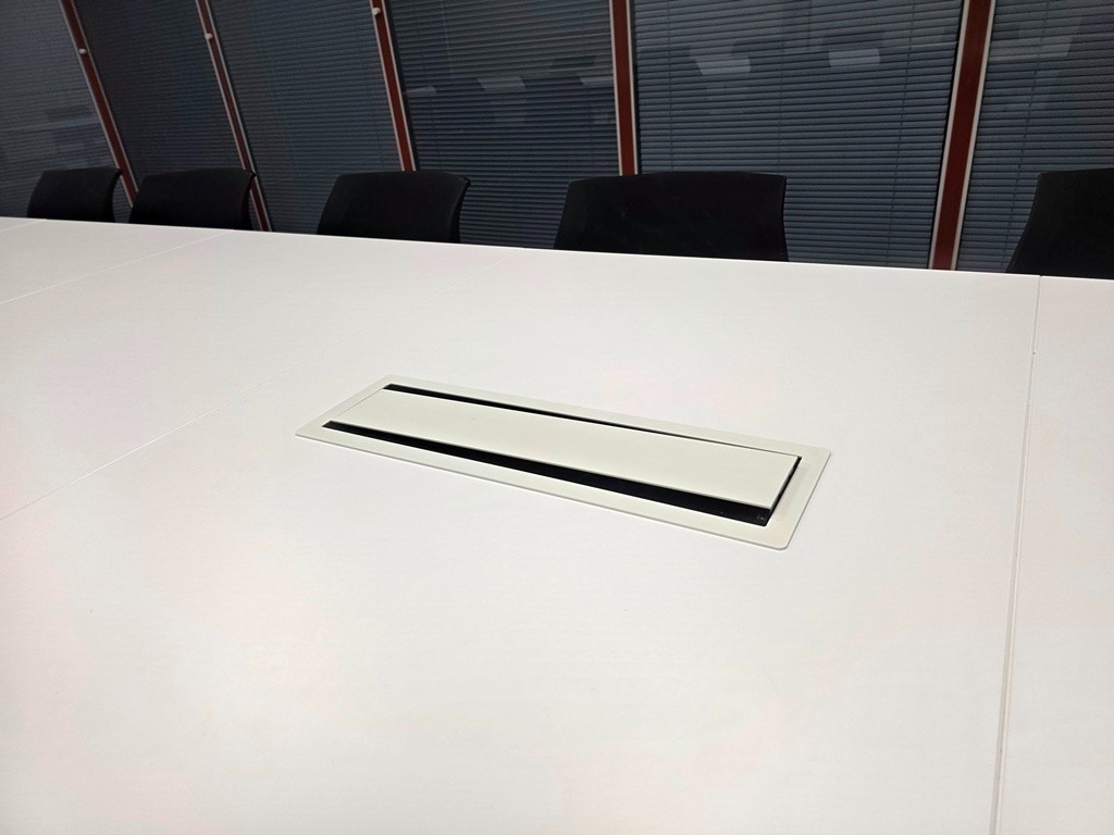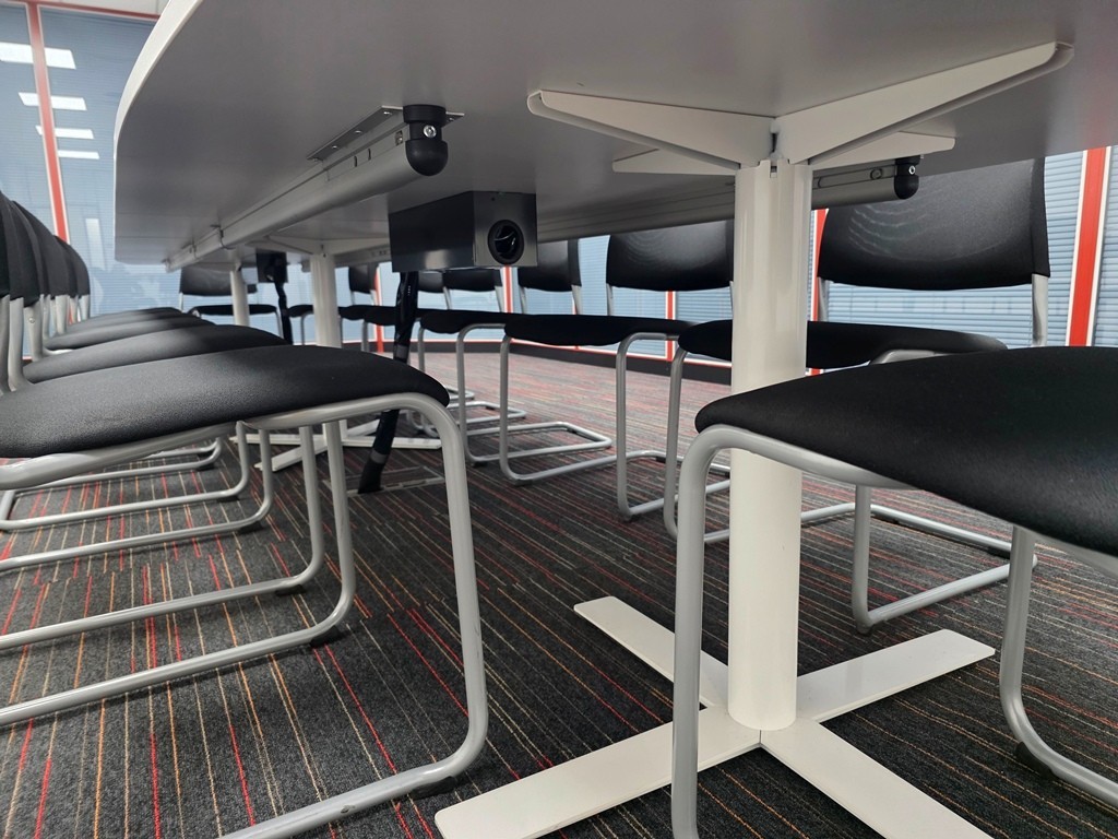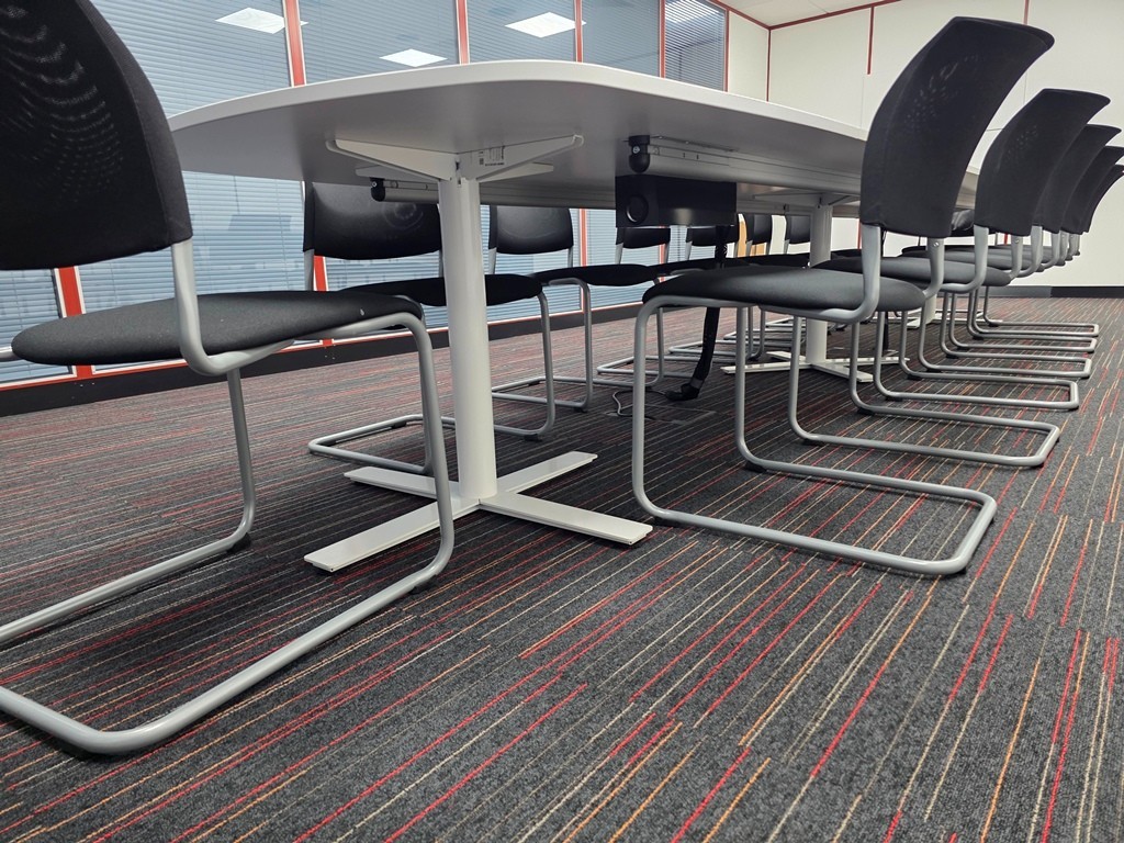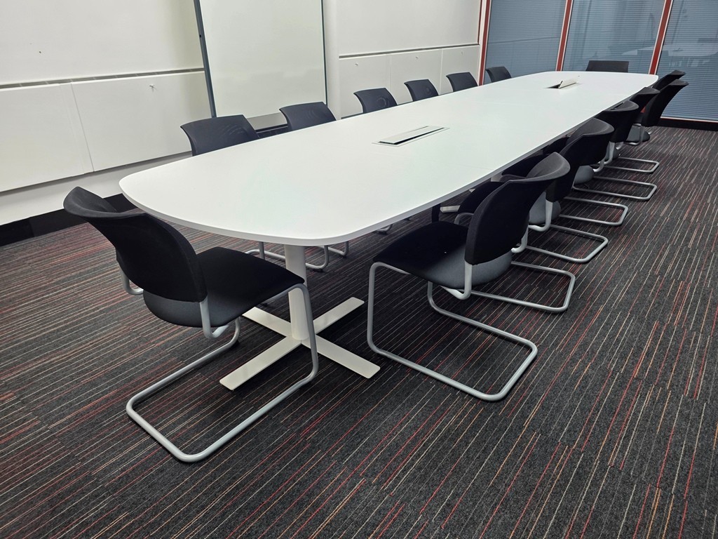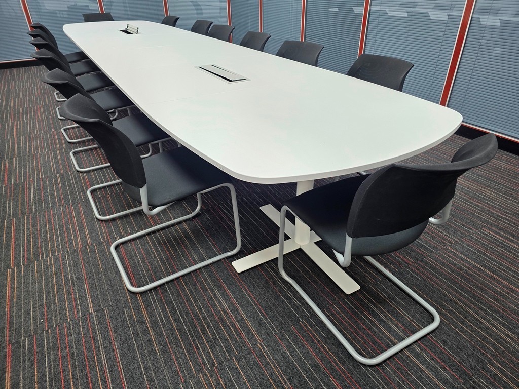 Large Kinnarps conference/meeting room table in white, made from 6 tabletop sections to form one spacious boardroom setup. Includes 14 stacking meeting chairs.