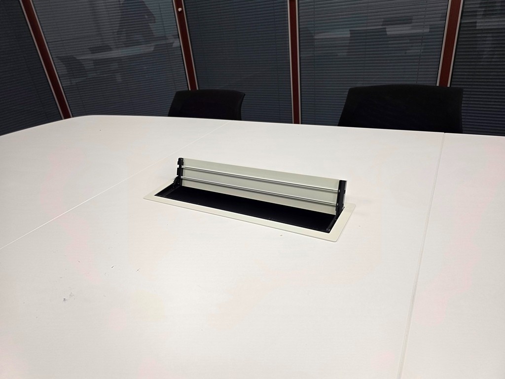 • Cable management: flip-up tabletop cable access + under-table cable tray/trough