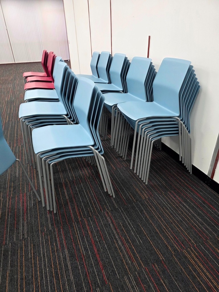 Set of 47 Kinnarps Leia 540 Stackable Meeting Chairs – Sky Blue Shell & Steel Frame