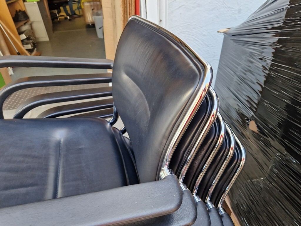 Elevate any boardroom or meeting space with these premium Kusch + Co leather meeting chairs, featuring sleek chrome frames, padded armrests, and space-saving stackable design.