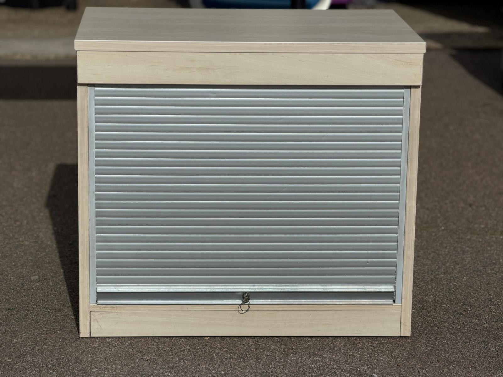 Practical low-height office storage cupboard with a lockable tambour (roll-front) door — ideal for files, stationery, IT equipment, printers, or general workplace storage.
