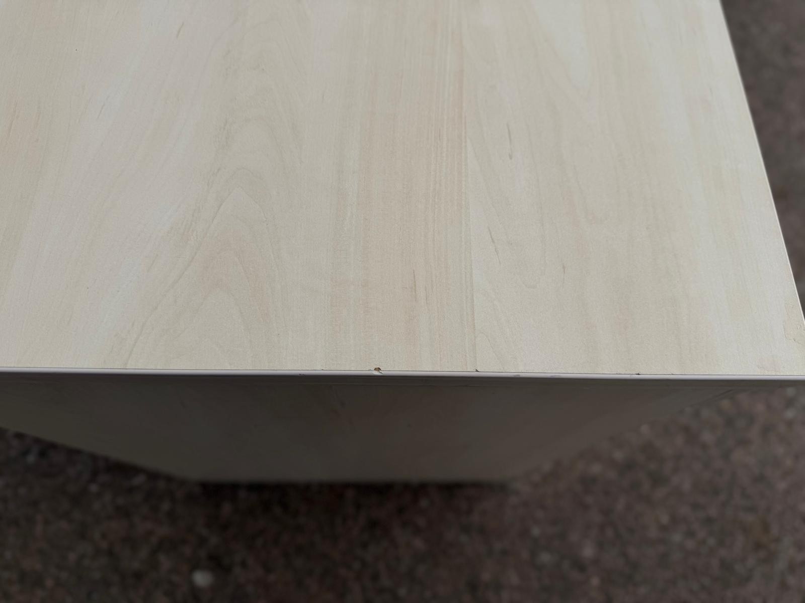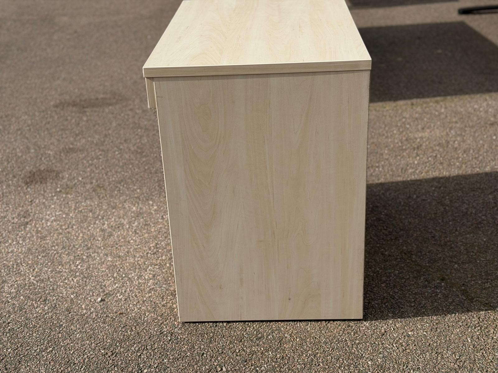 Finished in a clean light maple tone with a silver shutter front for a modern, professional look.