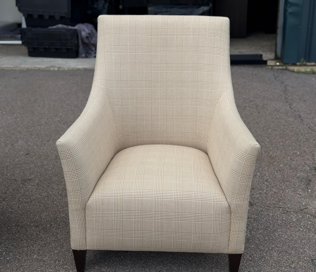 The shape is what makes them stand out: a gently flared backrest, rounded upholstered arms, and a deep comfortable seat that gives them a more elegant look than a standard waiting-room chair.