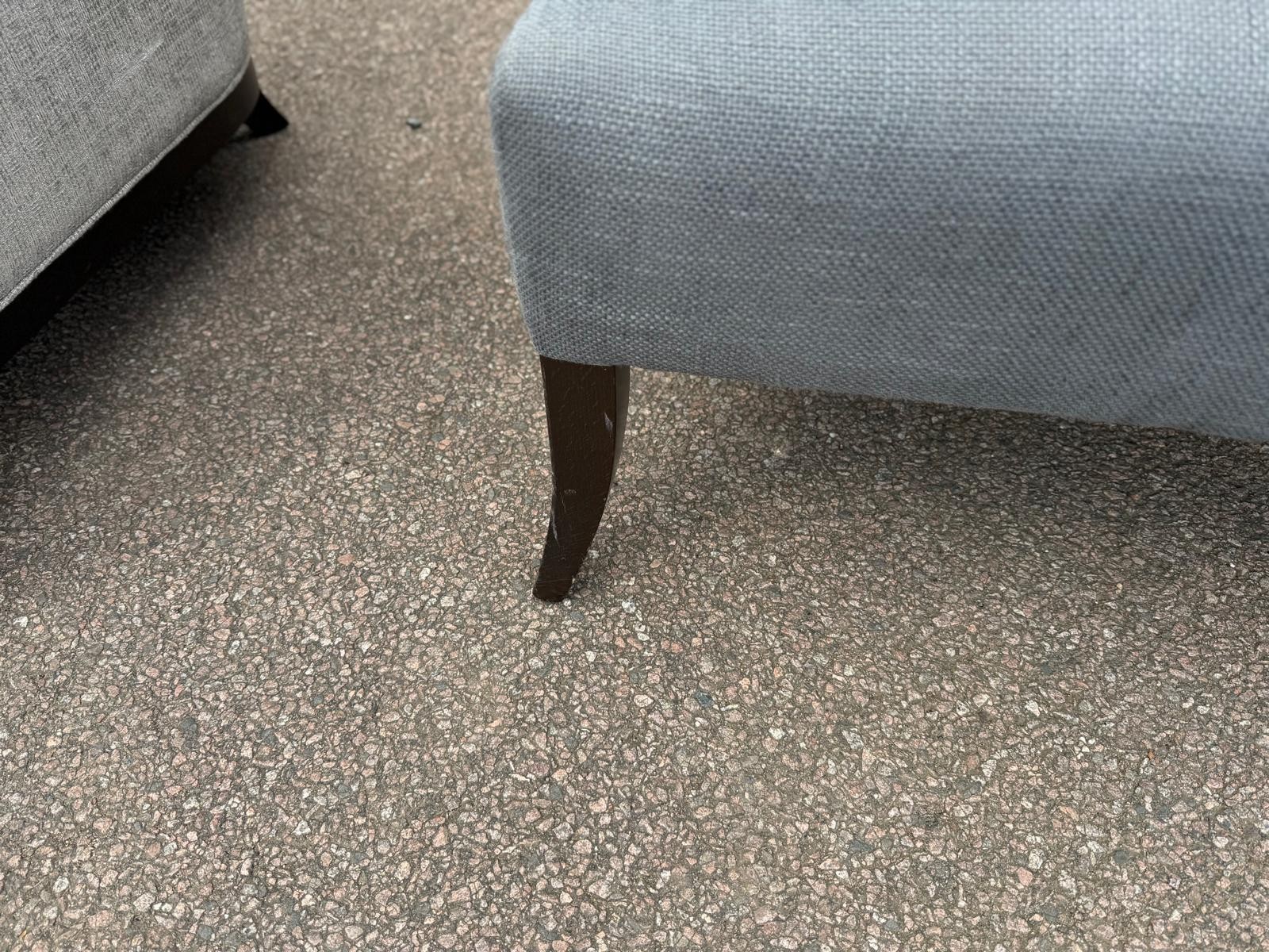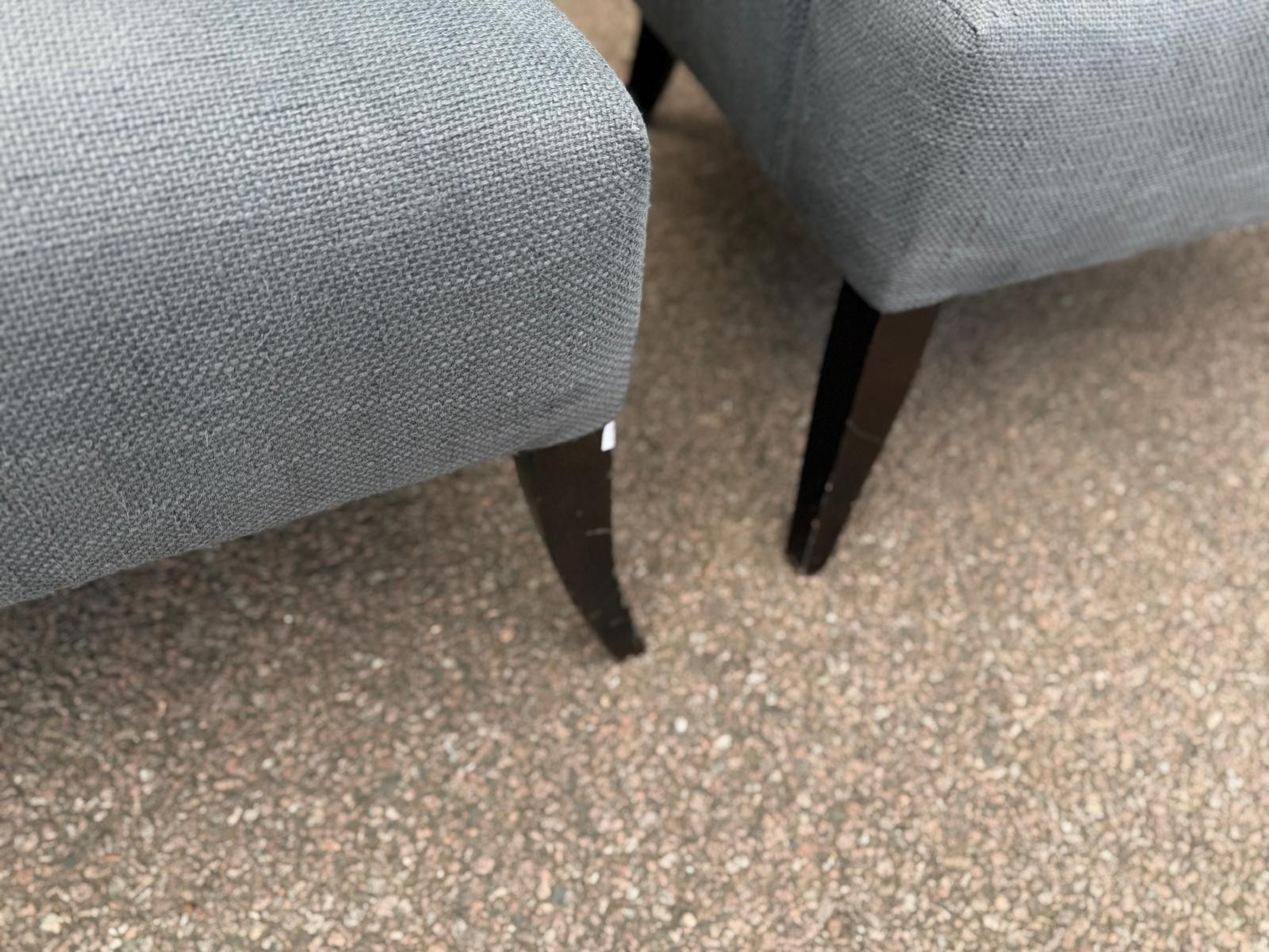 Smart and inviting set of 2 grey upholstered lounge armchairs, with a soft curved back, generous seat, and classic dark wooden legs.