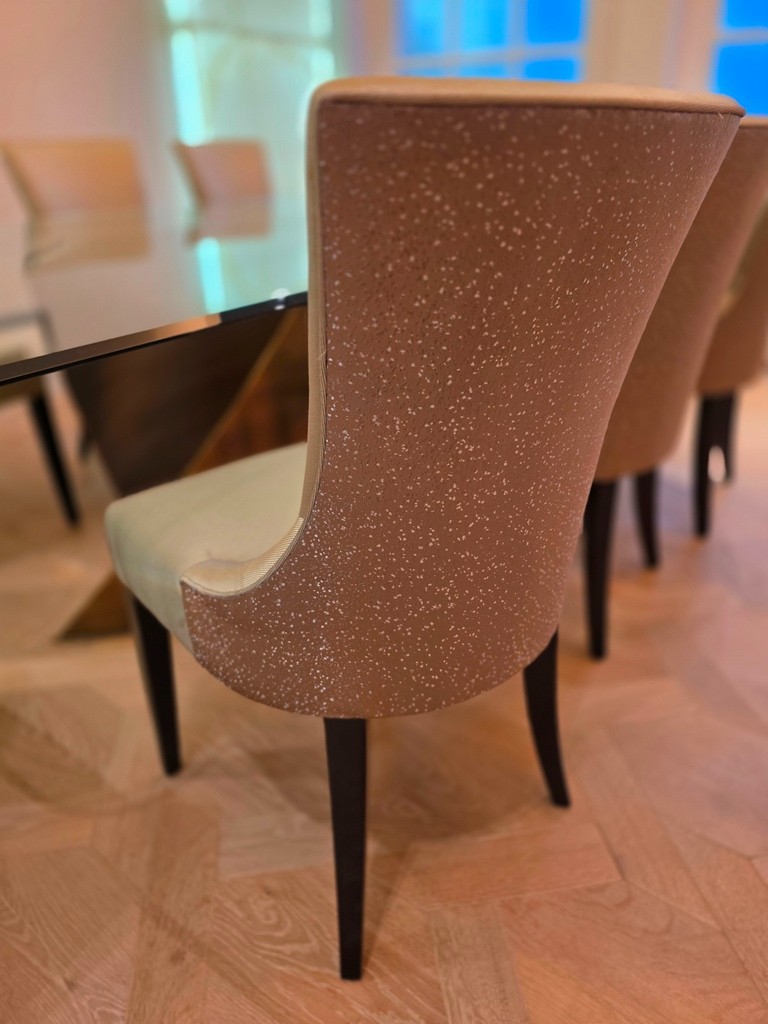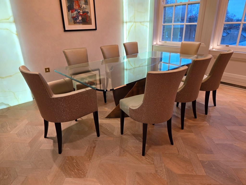 Includes 8 upholstered dining chairs from The Sofa & Chair Company — a mixed set with 6 × Charles chairs and 2 × Charles Carver armchairs (perfect for the ends of the table).