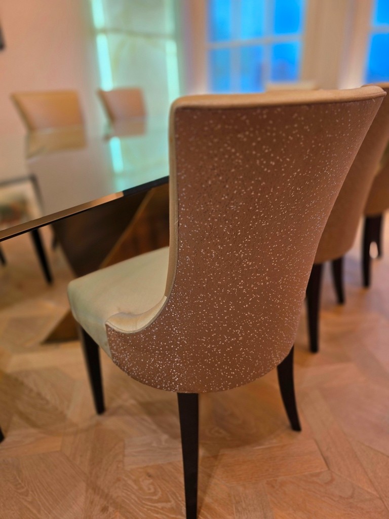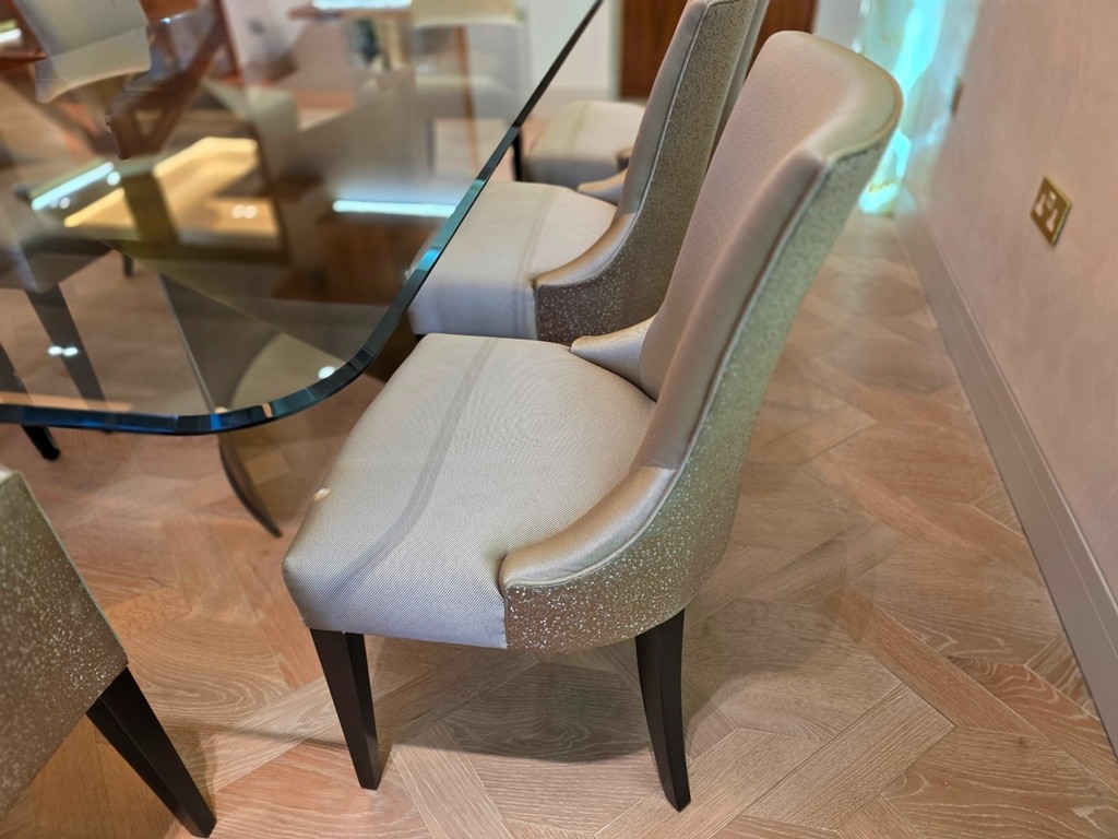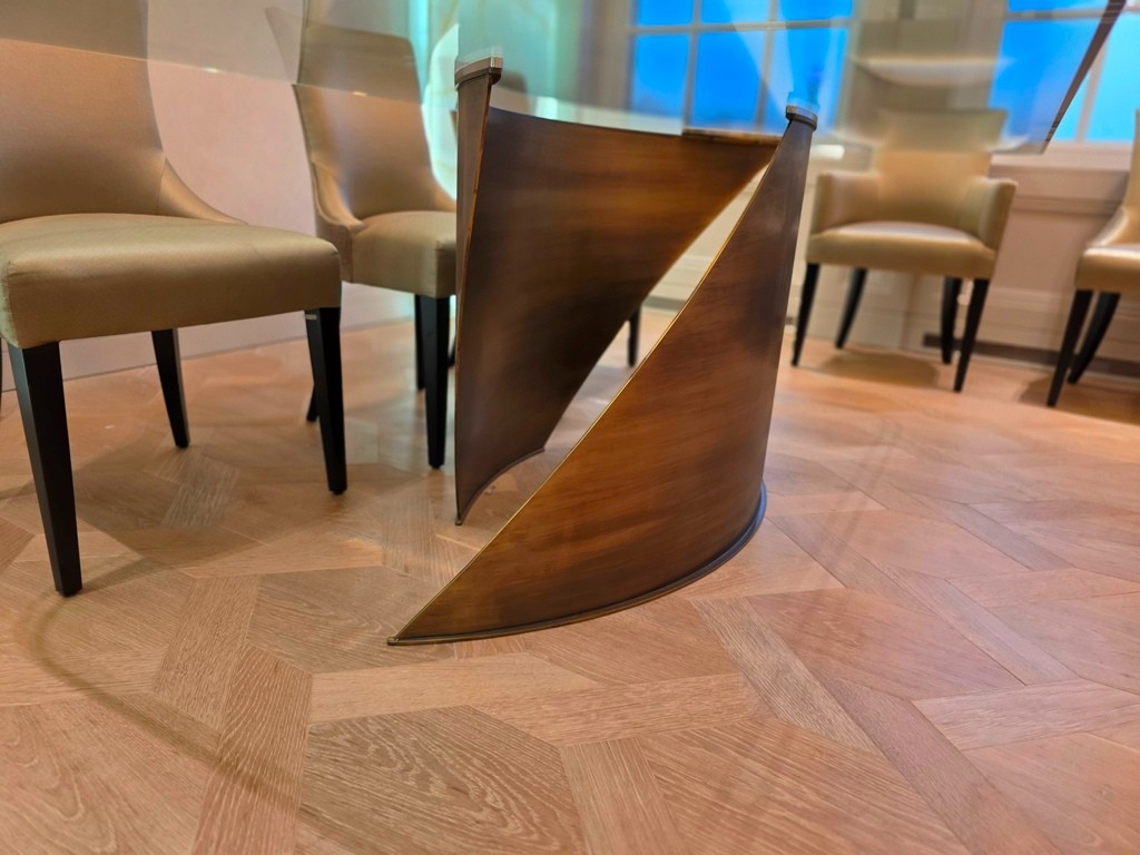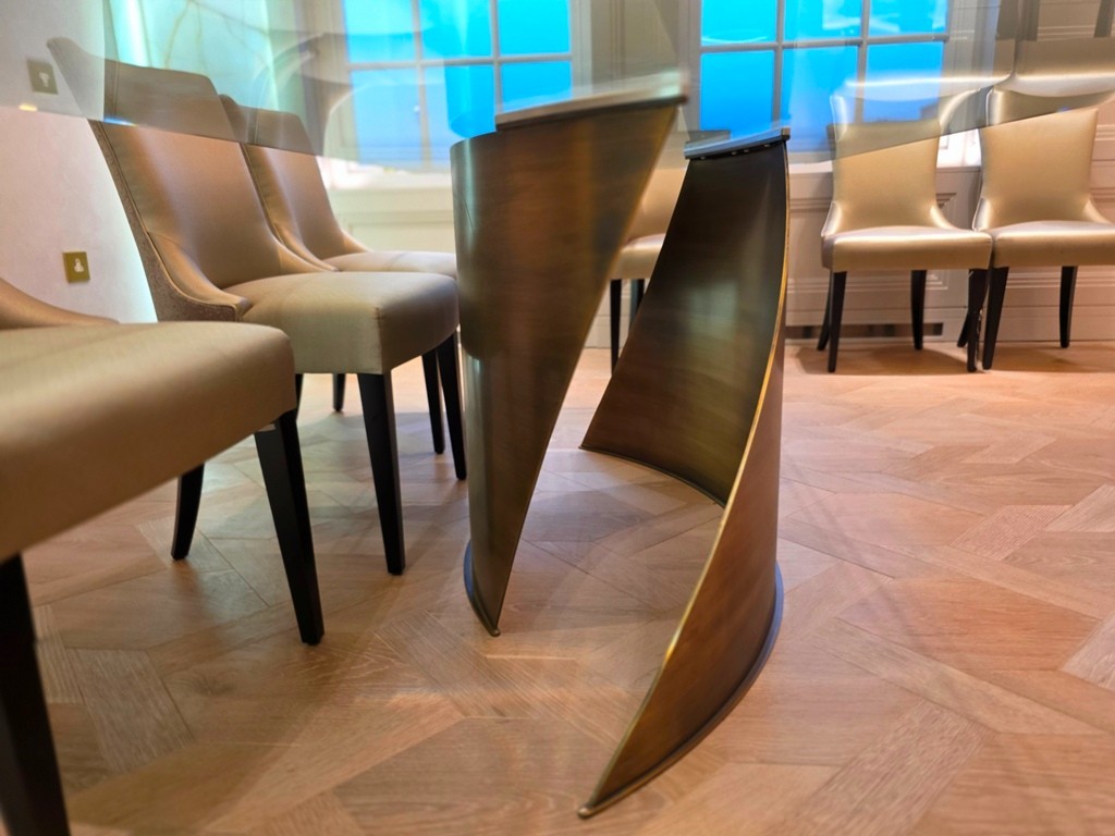 Premium dining set with a striking 2cm thick glass tabletop supported by two curved brass-effect metal blades, creating a distinctive “floating” look.