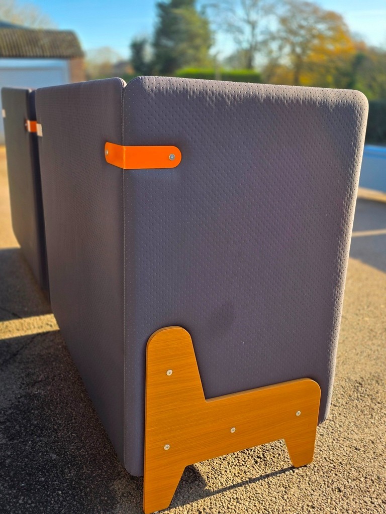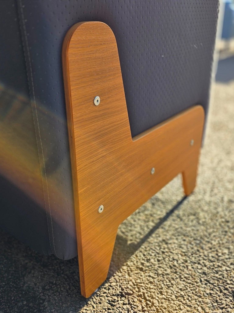 • Two-tone upholstery (dark grey sides / light grey seat) with wood-look side panels