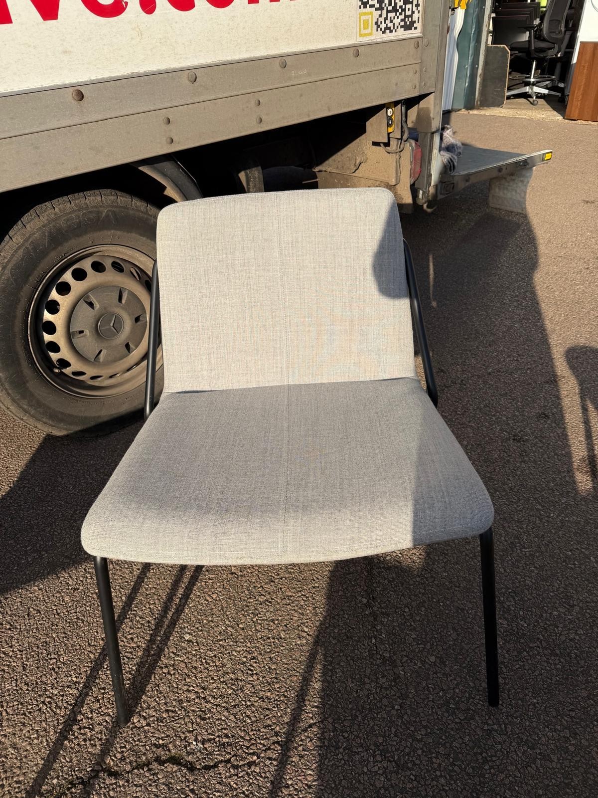 A stylish set of 9 contemporary lounge / reception chairs featuring upholstered fabric seats and sleek black metal frames. This set includes a modern mix of colours: 4 white/cream, 2 blue, 2 green and 1 pink chair – ideal for creative offices, reception areas, breakout spaces or waiting rooms.