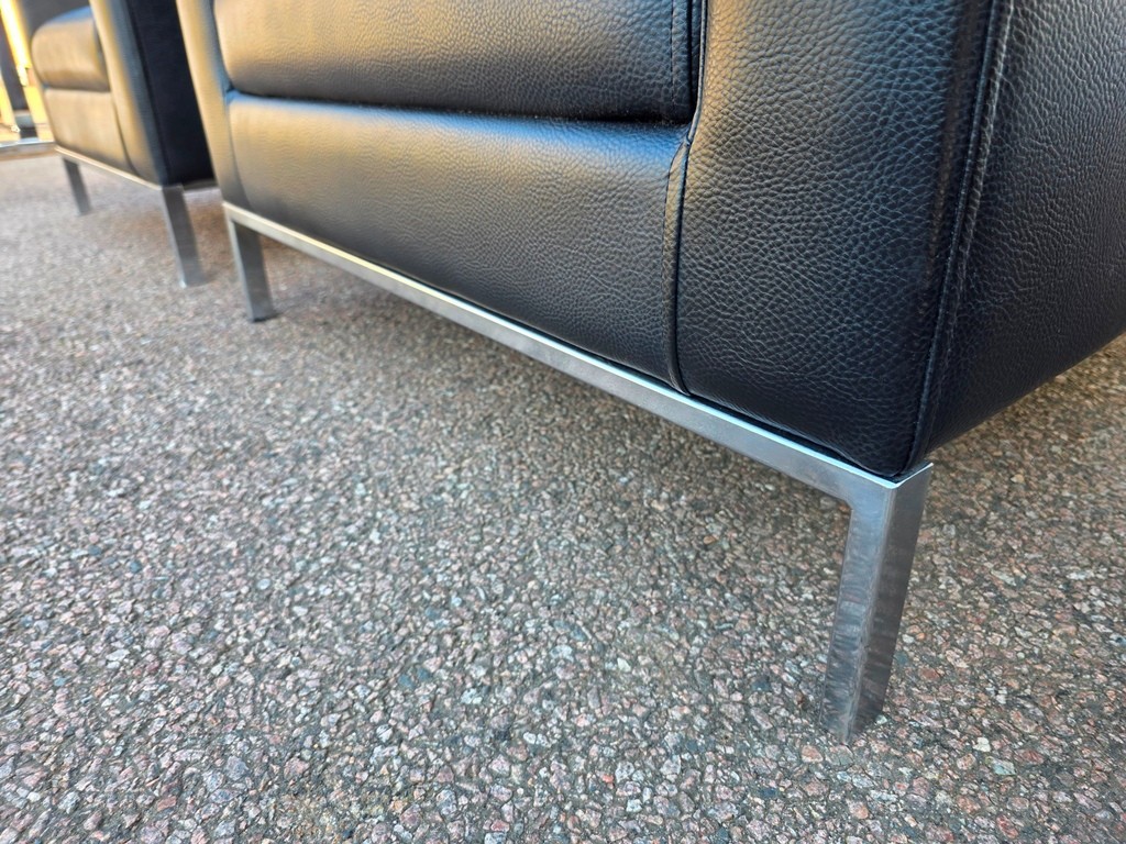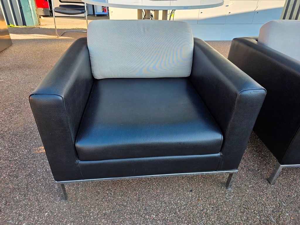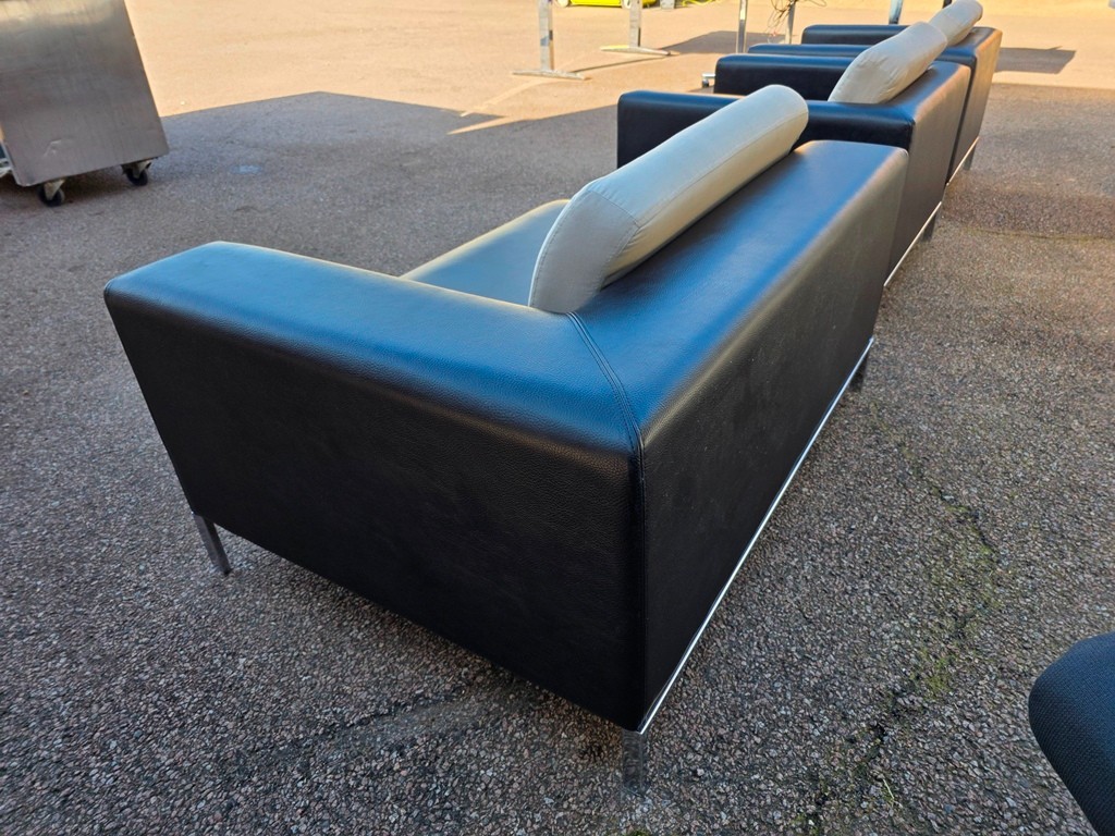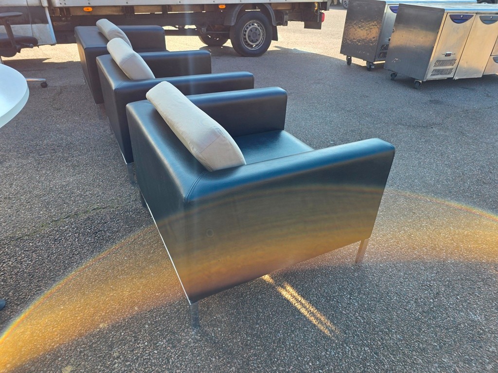 The set includes 2 matching armchairs and 1 wider sofa, finished in black leather-effect upholstery with contrasting fixed white back cushions and slim chrome frame.