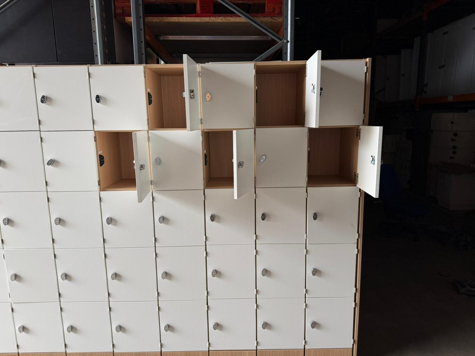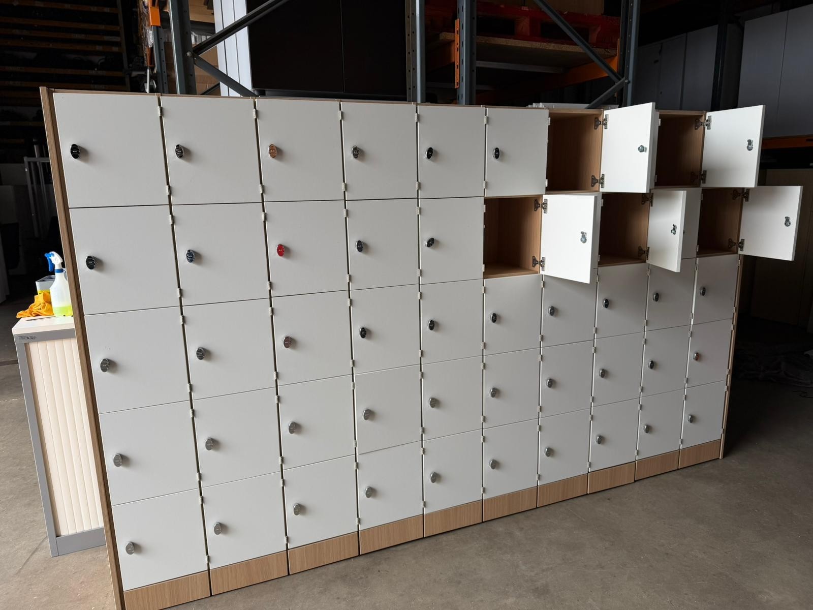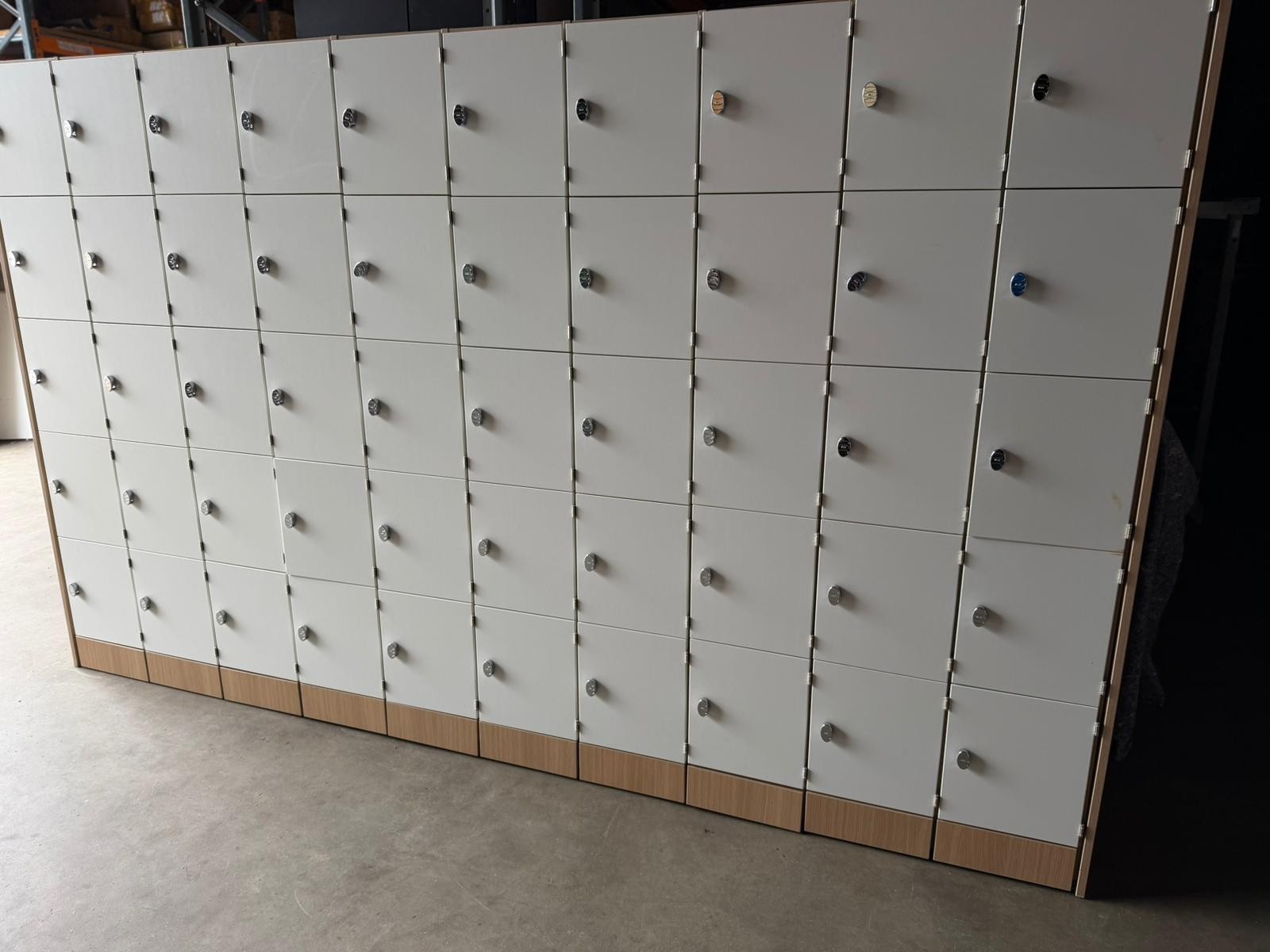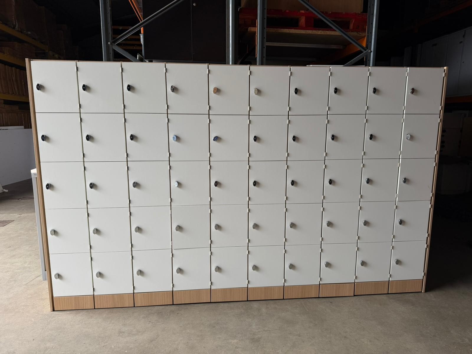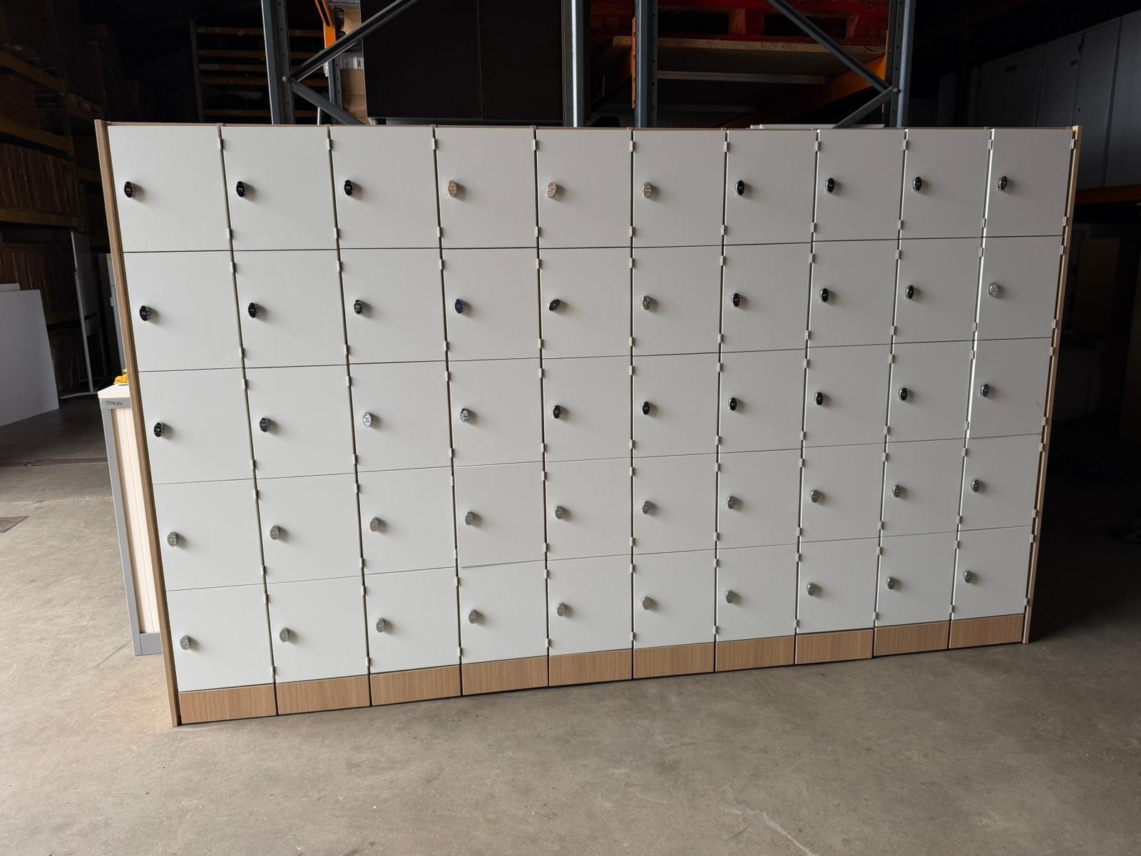 🗄️ 50-Compartment Locker Cabinet Unit – Off-White Doors & Wood Frame (3.6m Wide) (O-3119)