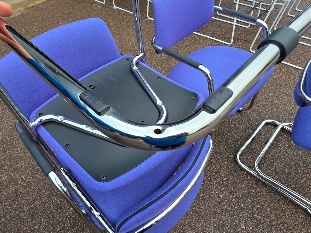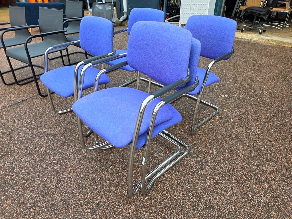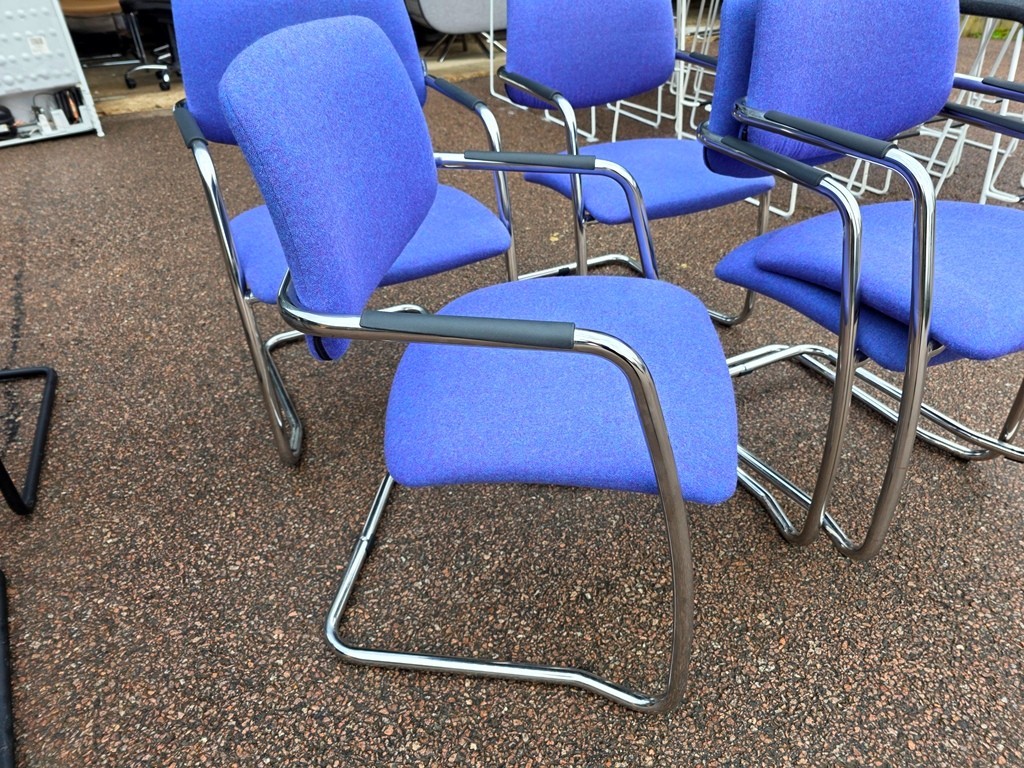 A smart, professional set of Narbutas cantilever meeting chairs in a striking blue finish, built on a sleek chrome sled/cantilever frame with comfortable armrests. Ideal for meeting rooms, boardrooms, reception/waiting areas, training rooms, and client-facing spaces where you want a clean, modern look.