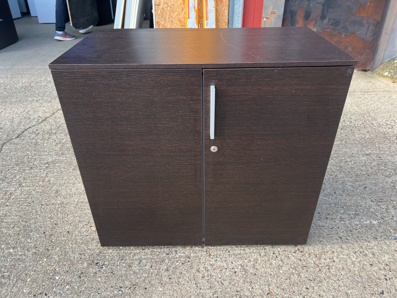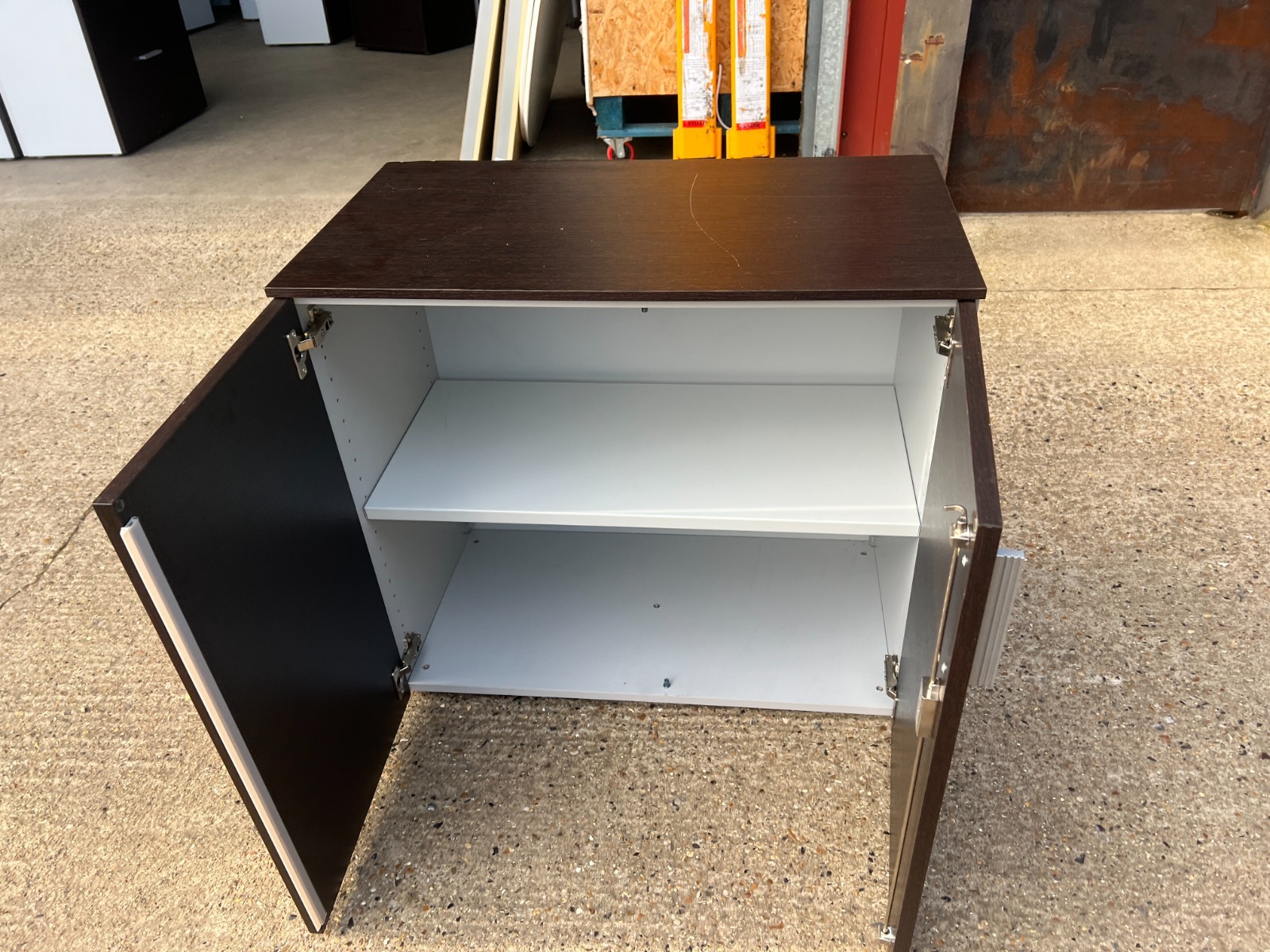 Smart, professional office storage cupboard with a dark wood-effect finish and contrasting white sides.