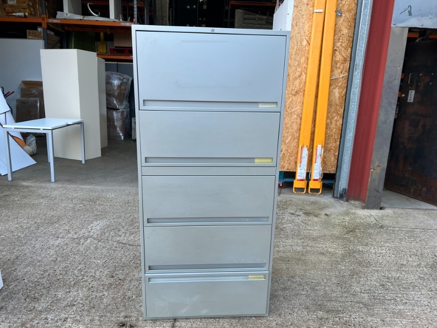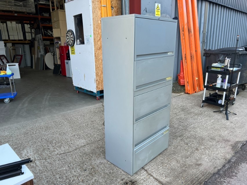 A tall, space-saving filing cabinet with foolscap suspension rails for organising hanging files in an office or home workspace. Ideal for tidy document storage with easy access.