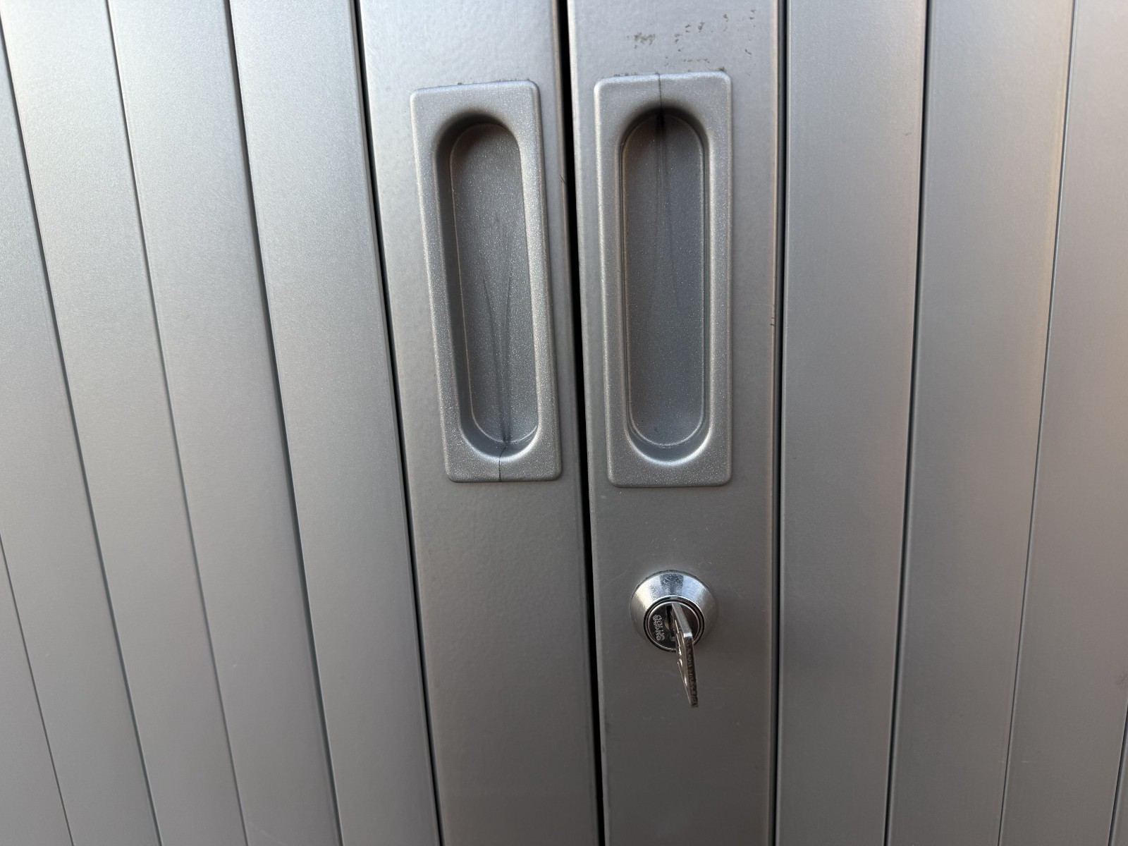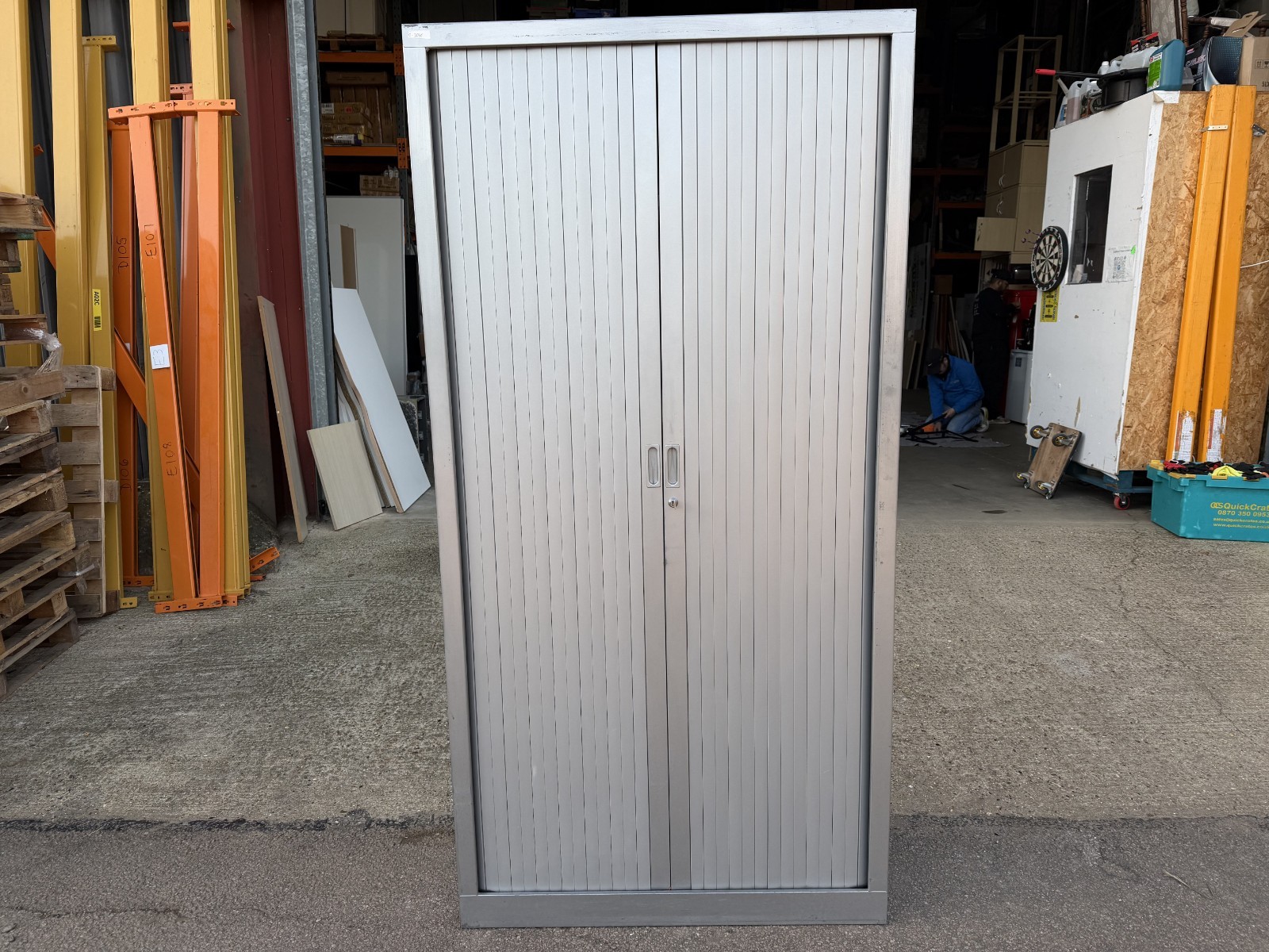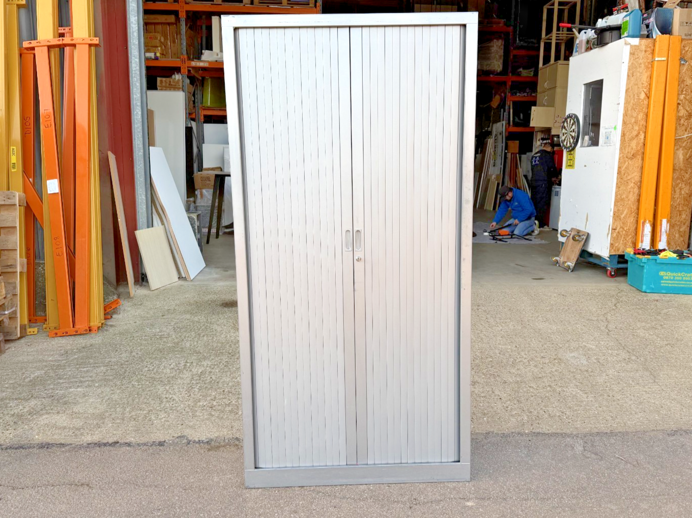 Space saving roller shutter storage cabinet ideal for office, workshop, or general storage. Lock and key shown in photos