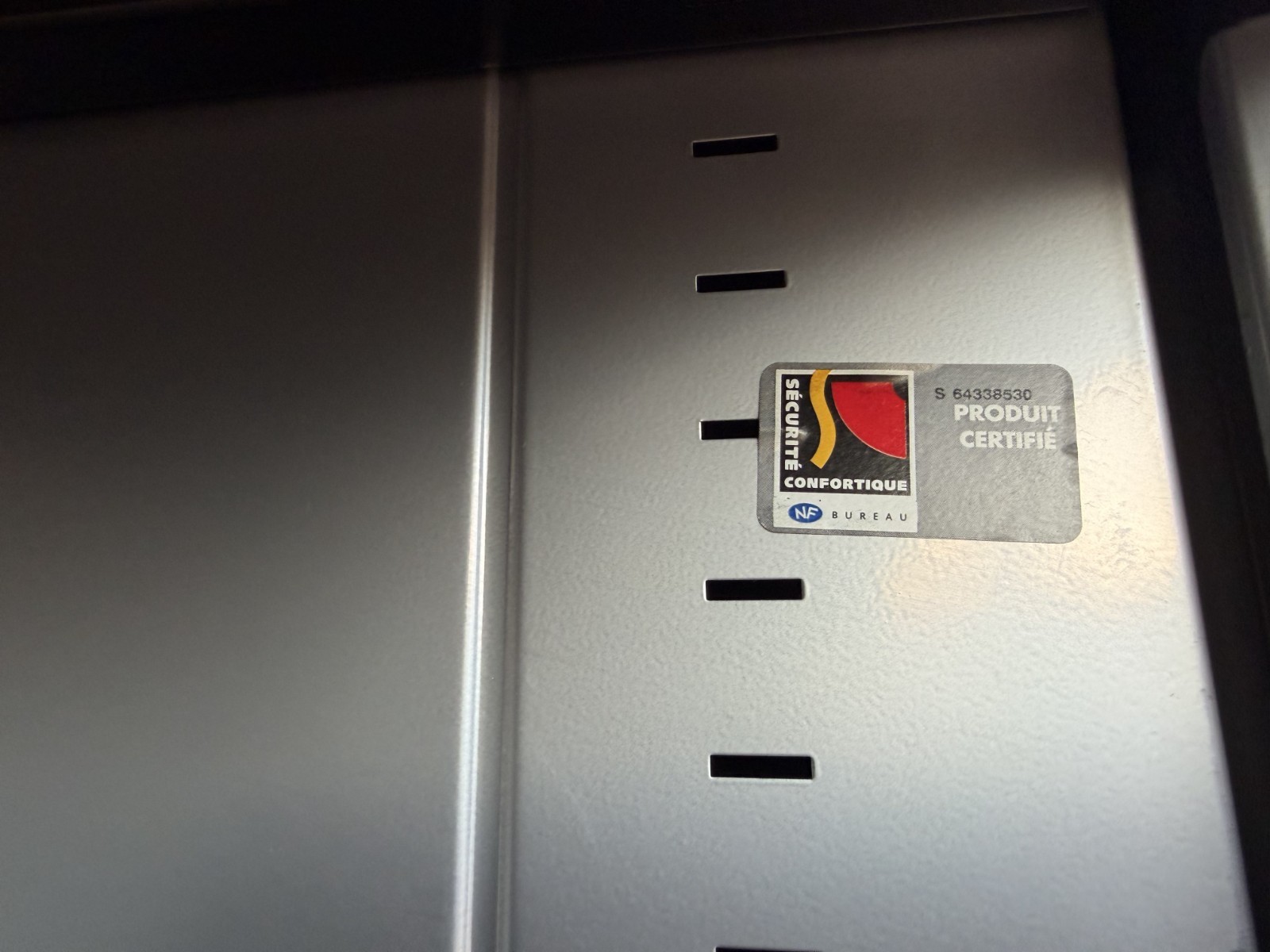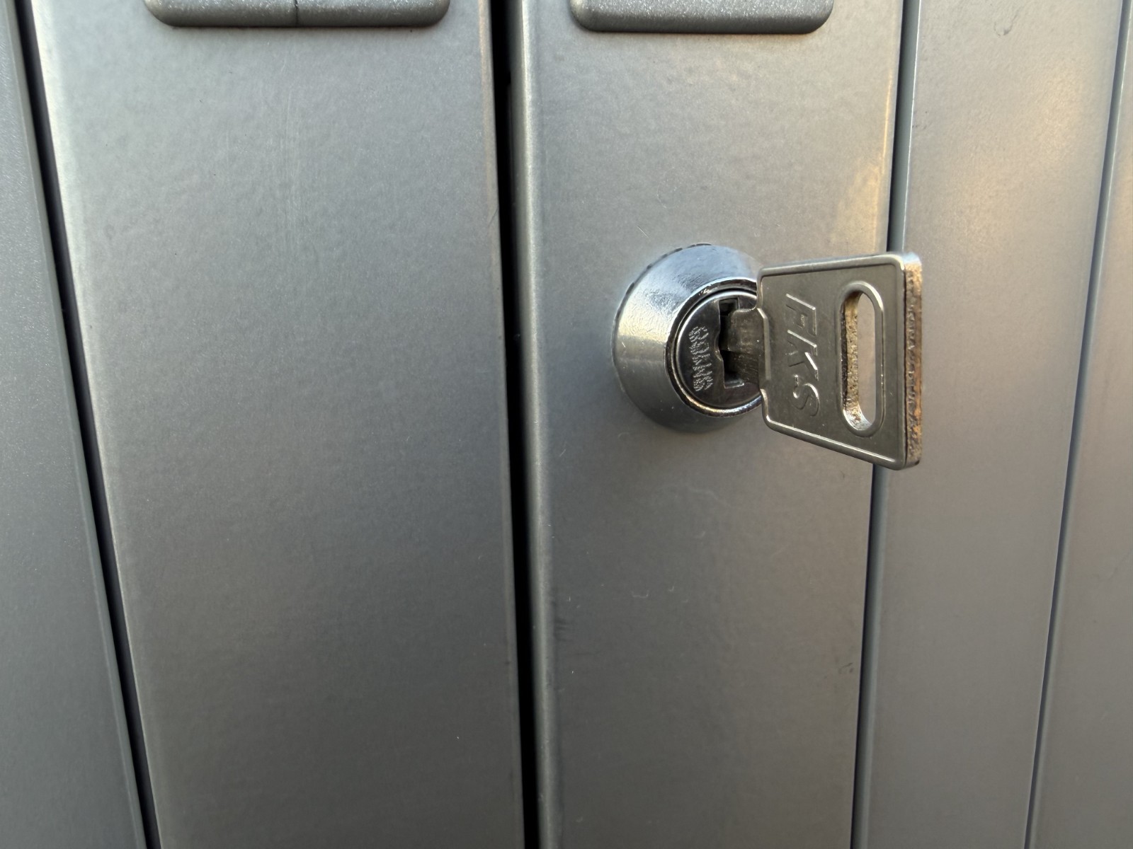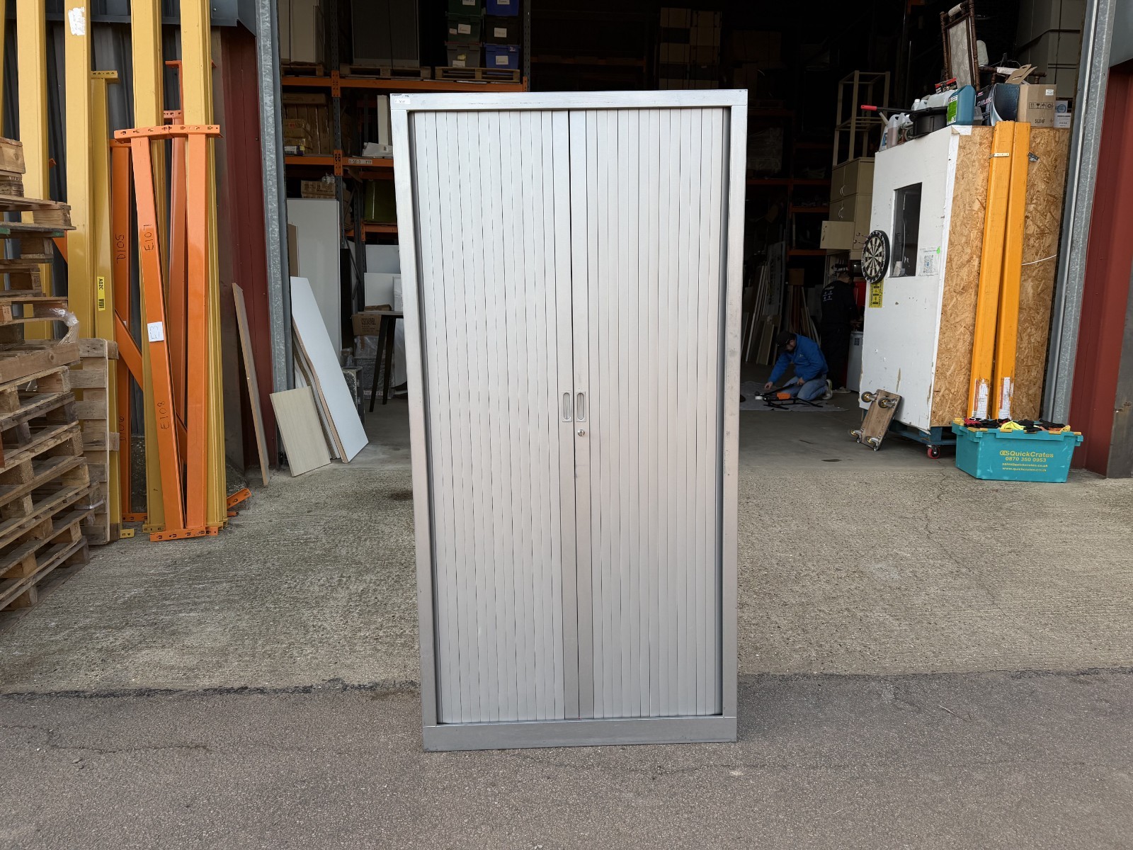 Space saving roller shutter storage cabinet ideal for office, workshop, or general storage. Lock and key shown in photos