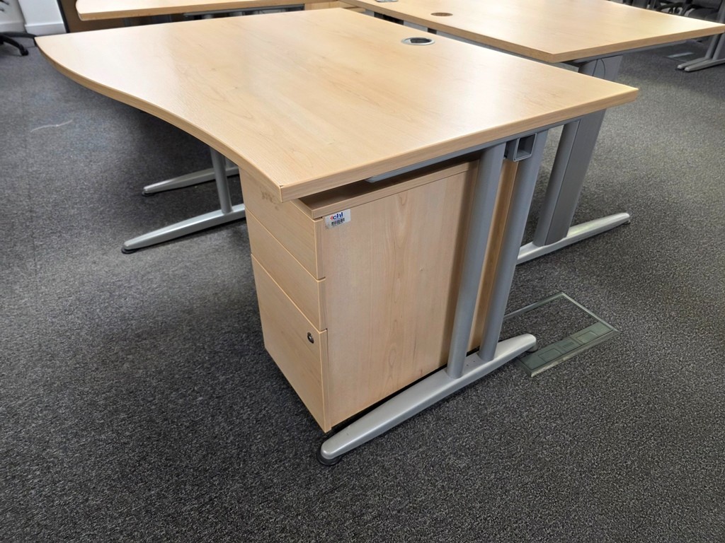 Refurbished for modern office use, this 120 cm wave-front desk offers style and practicality, including a slim lockable mobile pedestal and cable management.