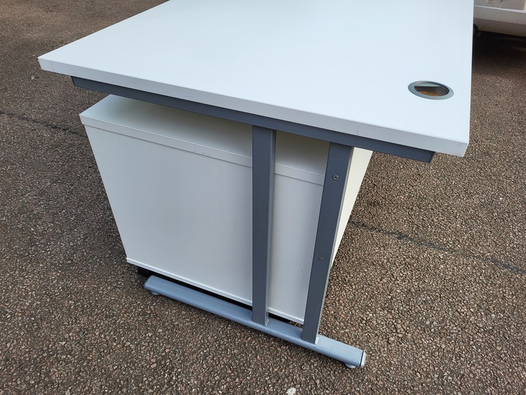 A clean, professional workstation with a white top and steel legs, ideal for home offices and commercial workspaces. Includes a lockable mobile pedestal for organised storage.