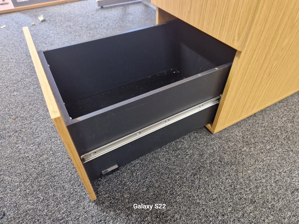 Add functionality and timeless style to your workspace with this refurbished beech wood office desk, complete with a matching extending pedestal cabinet. Perfect for home offices, corporate environments, and co-working spaces.