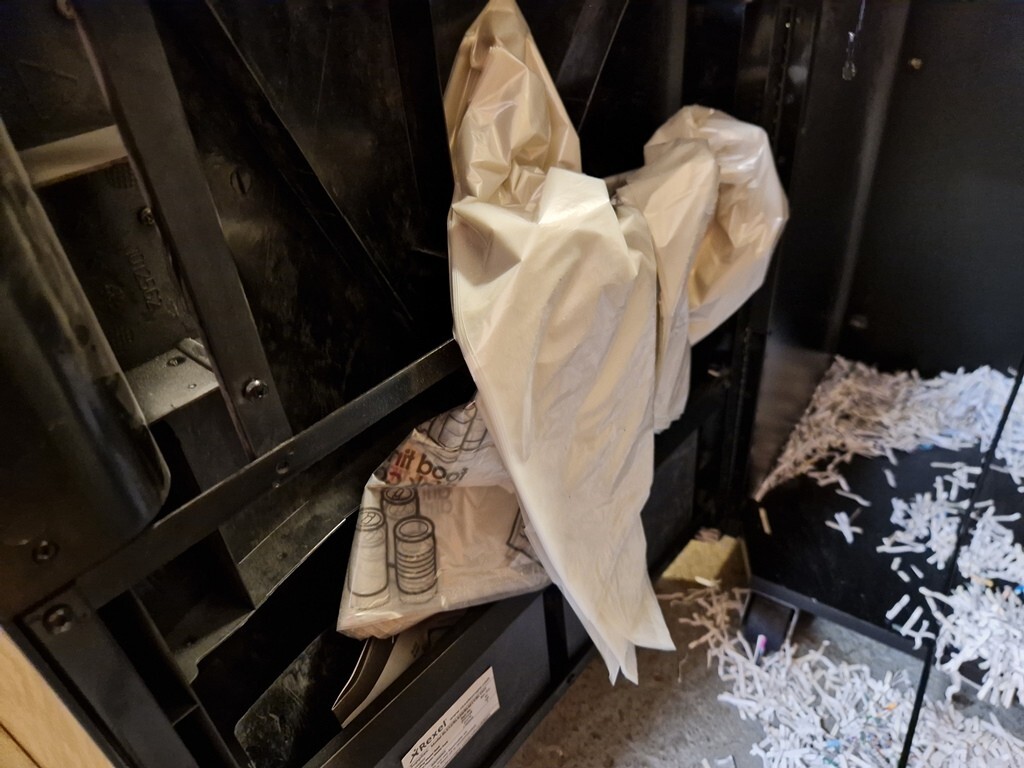Massive 115 L Bin that holds up to 1,100 shredded sheets in recyclable bags via a convenient pull‑out frame