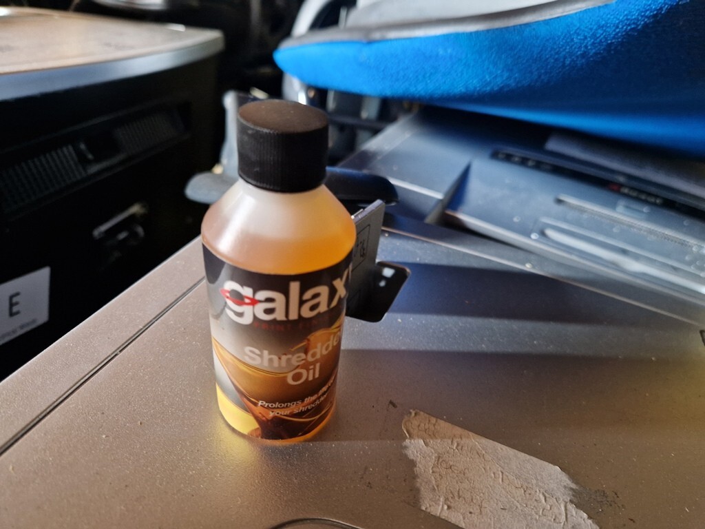 Starter bottle of shredder oil – ideal for maintaining the auto-oiler system. (Note: oil lasts around one week; additional replacement oil cartridges recommended.)