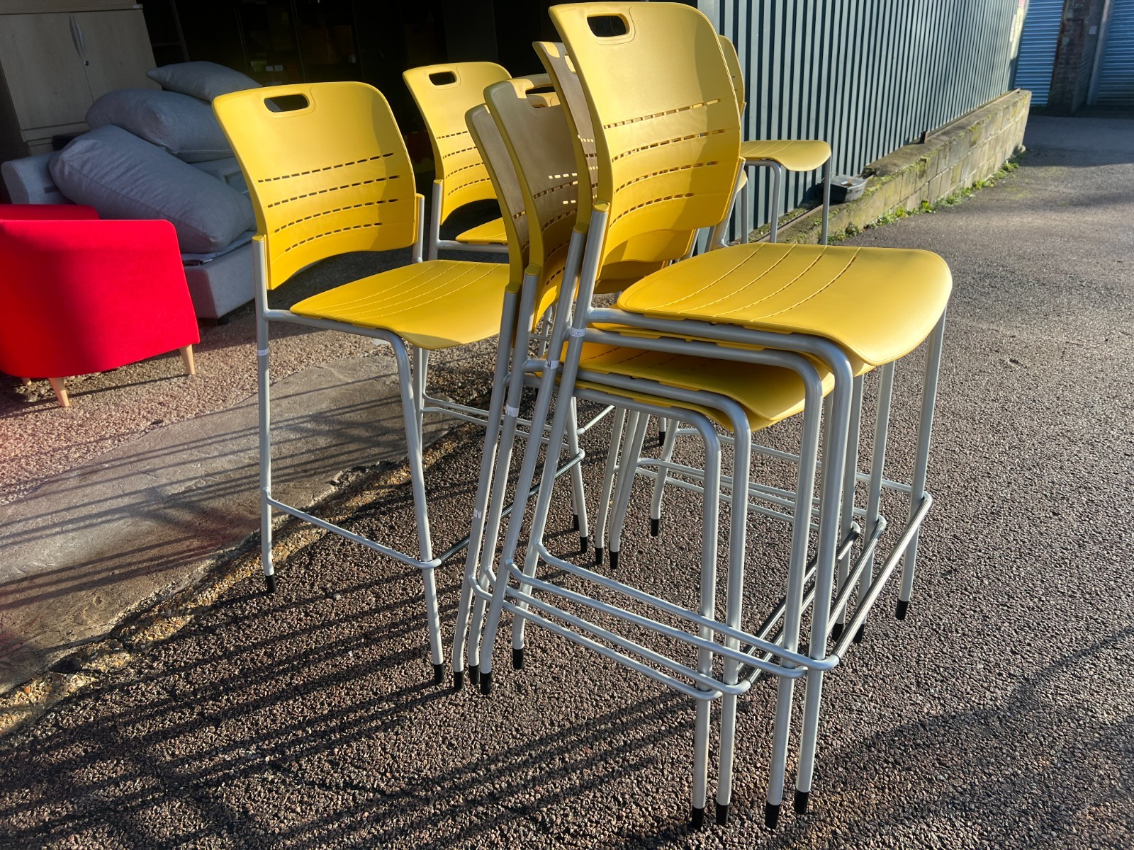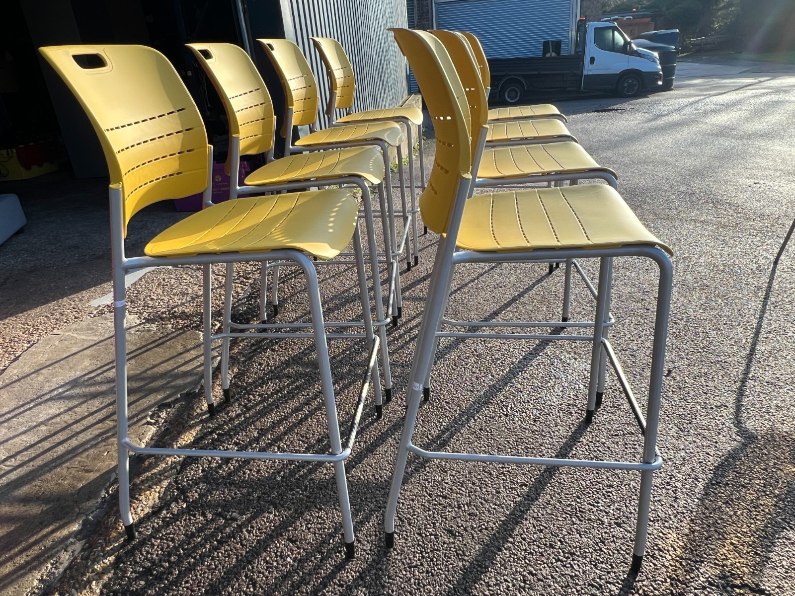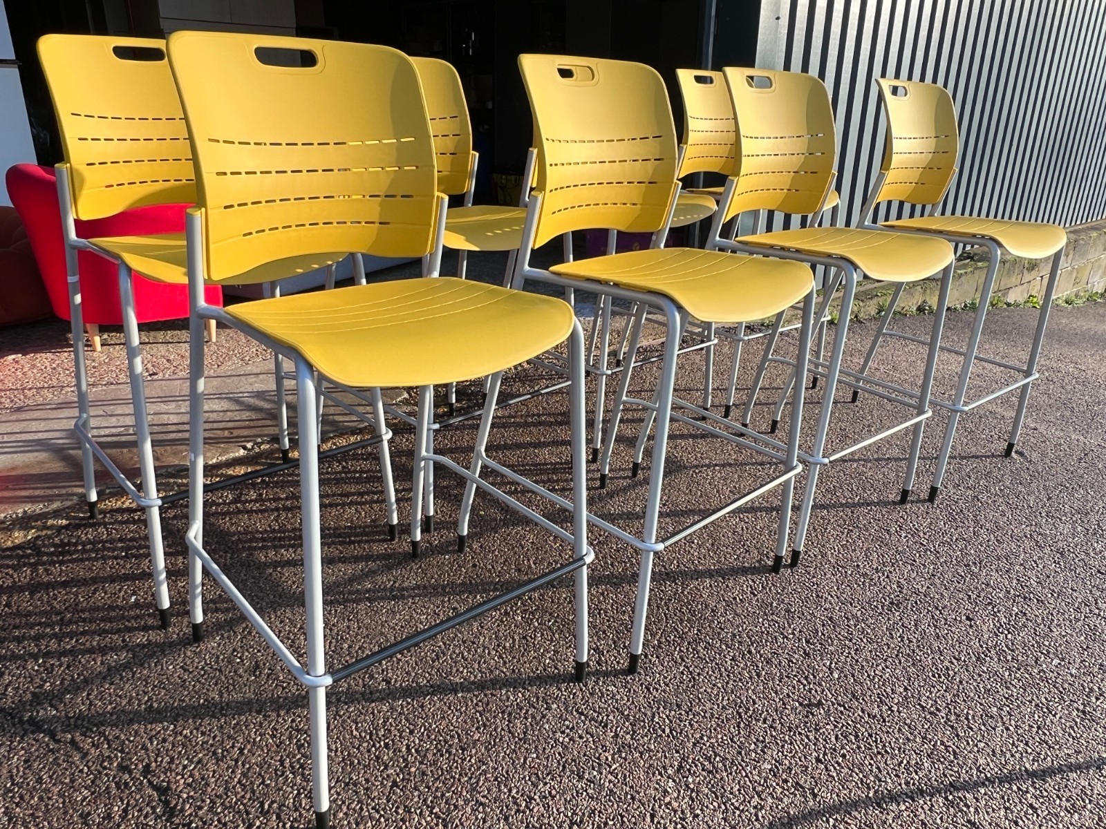 Set of 8 Senator bar stools with a bright citrus yellow seat/back and a sturdy silver frame.